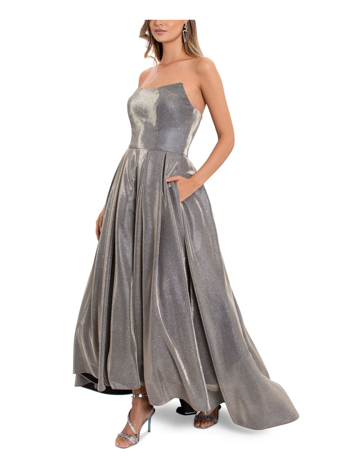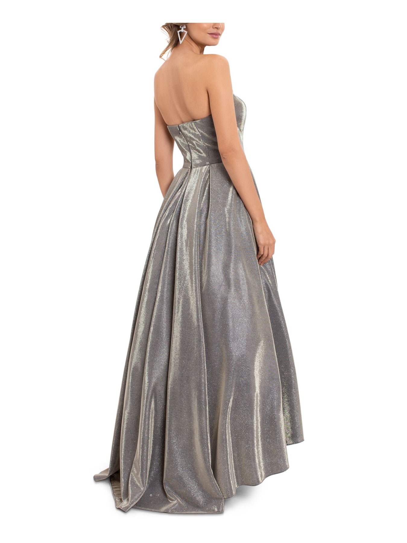 Womens Silver Pocketed Zippered Tulle Pleated Boning Hi Lo Hem Sleeveless Strapless Full-Length Formal Gown Dress