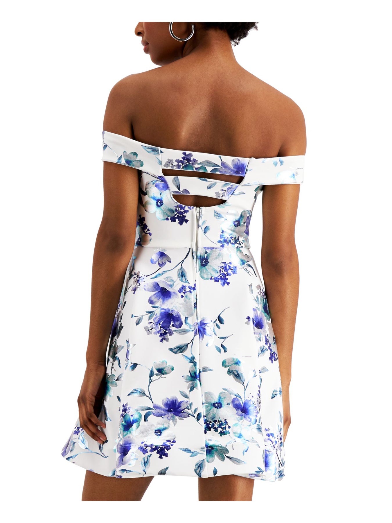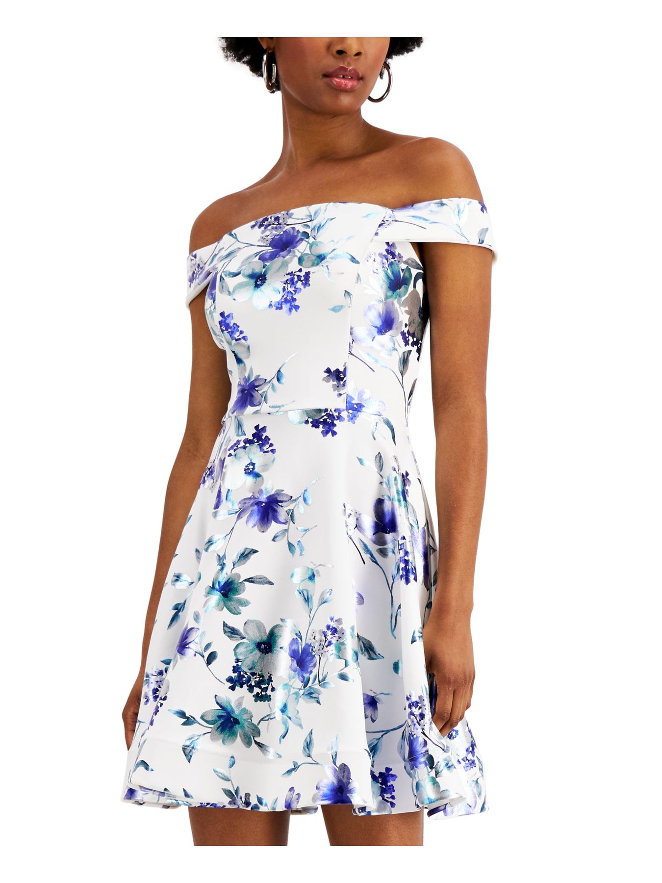 Womens Zippered Floral Cap Sleeve Off Shoulder Short Party Fit + Flare Dress