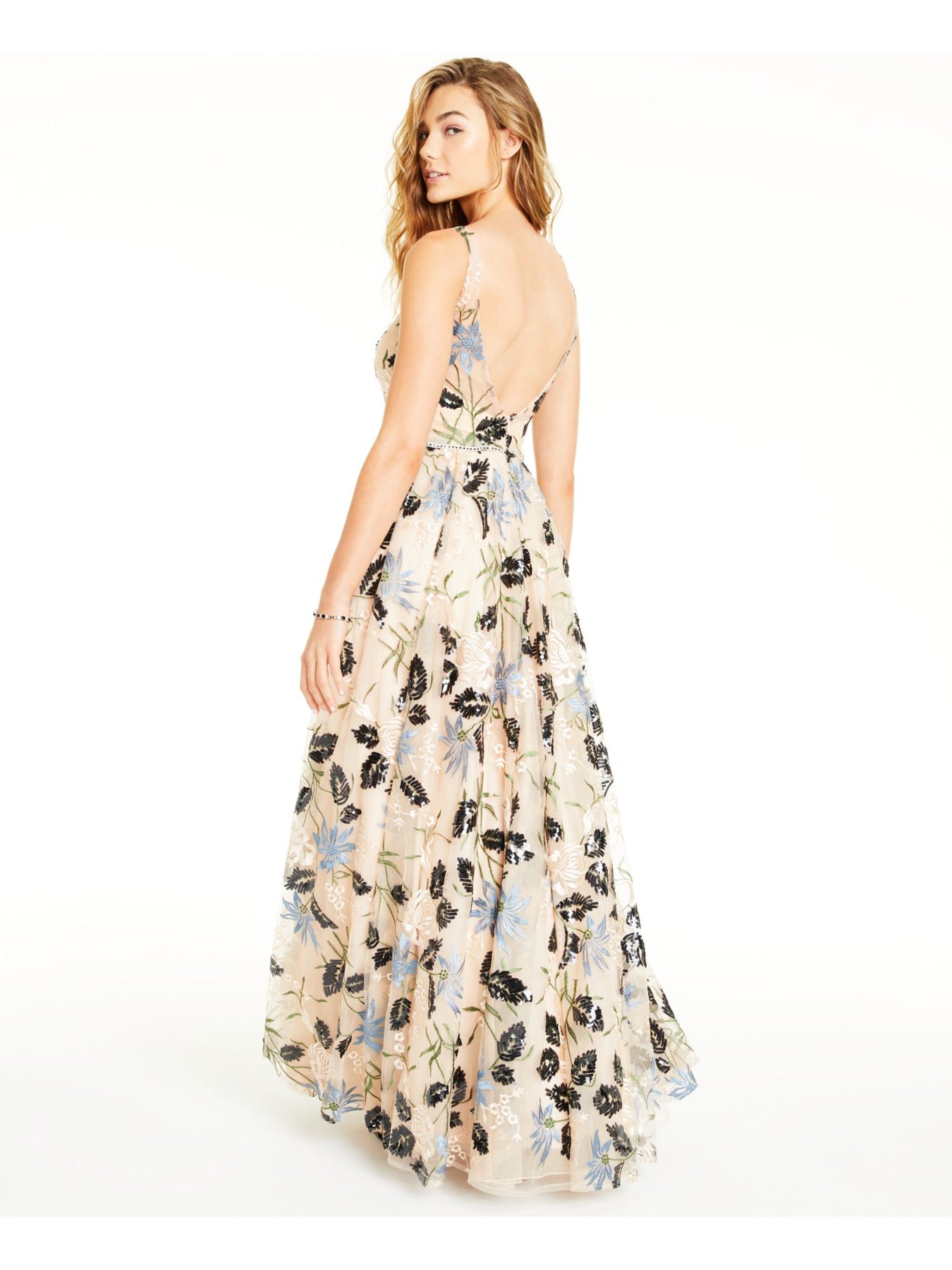 SAY YES TO THE PROM Womens Beige Embellished Sequined Floral Sleeveless Sweetheart Neckline Full-Length Formal Fit + Flare Dress 1