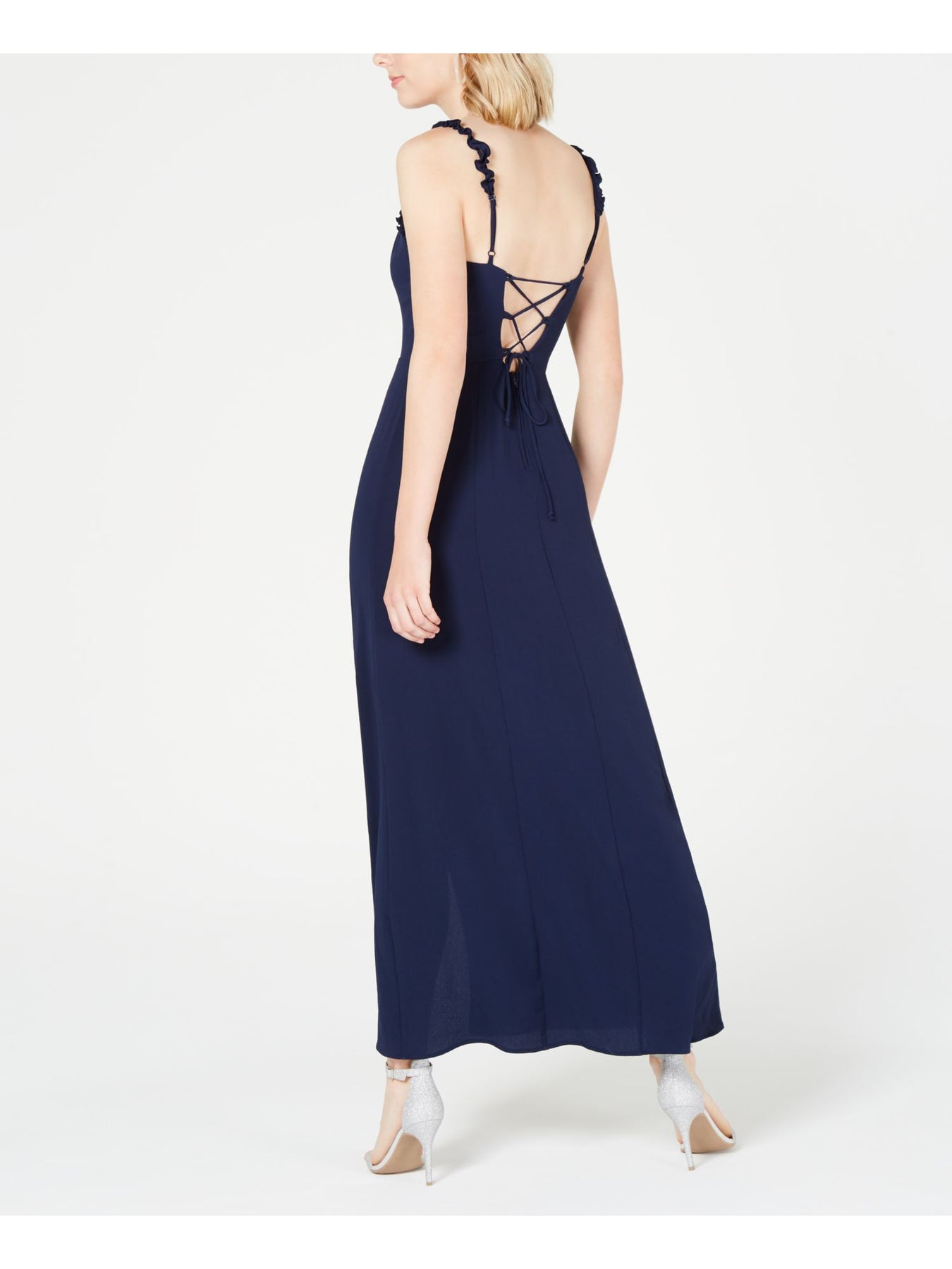 TEEZE ME Womens Navy Slitted Ruffled Spaghetti Strap Square Neck Midi Wrap Prom Dress 1\2