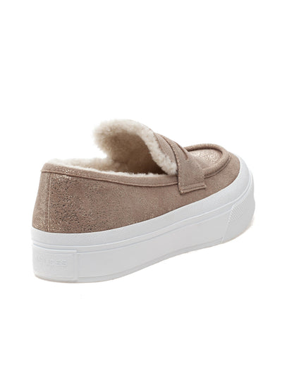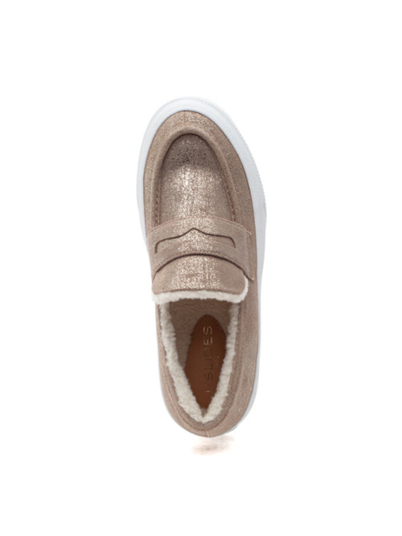 Womens Beige Gold Flake Penny Strap Notched Apron Toe Loafer Cushioned Removable Insole Giles Almond Toe Platform Slip On Leather Sneakers Shoes M