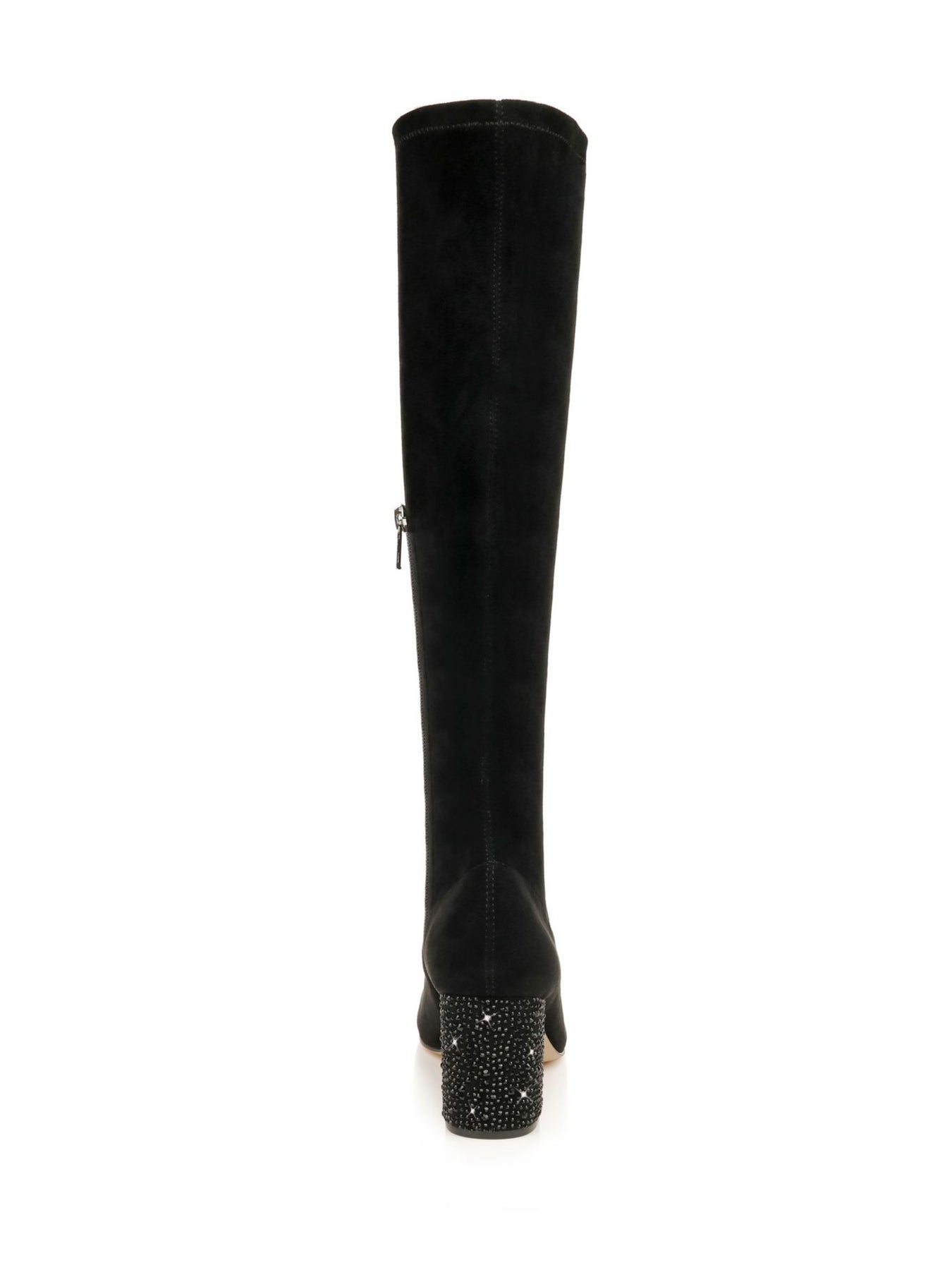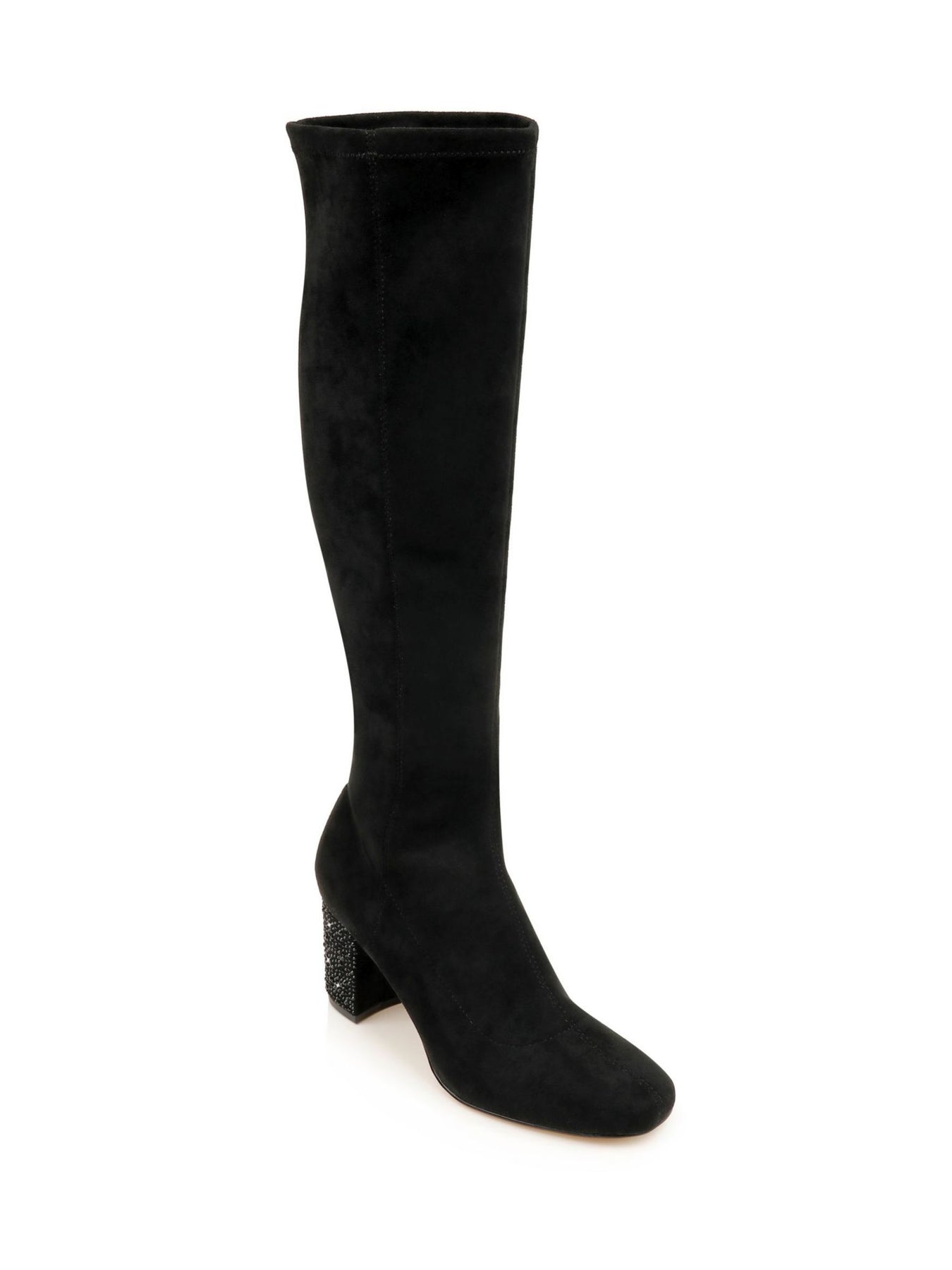 Womens Black Rhinestone Heel Stretch Padded Evalina Square Toe Block Heel Heeled Boots