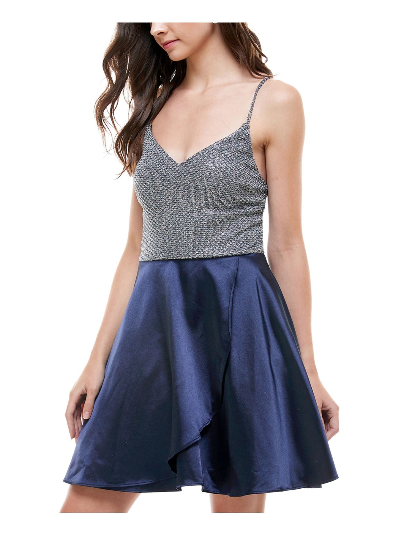 Womens Glitter Spaghetti Strap V Neck Mini Party Fit + Flare Dress