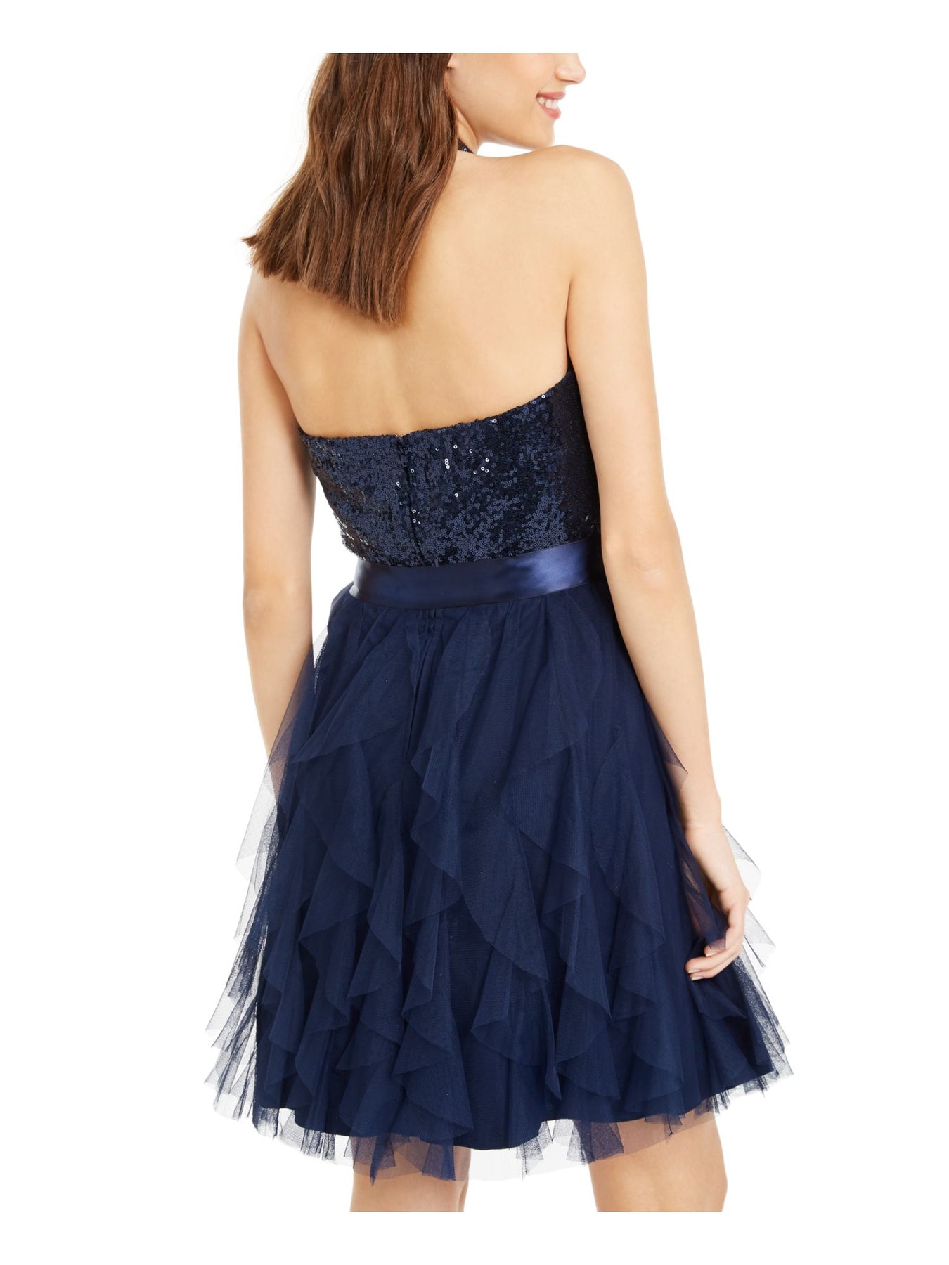 TEEZE ME Womens Fit + Flare Above The Knee Dress Navy Sequined Zippered Sleeveless Halter Party Juniors 1\2