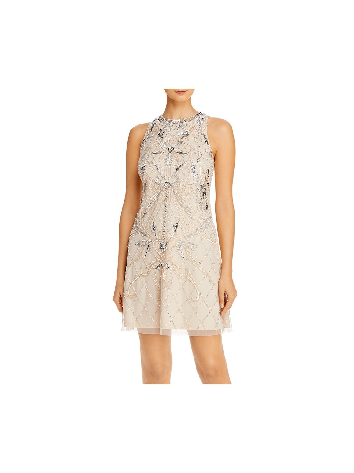 AIDAN MATTOX Womens White Sequined Beaded Sleeveless Jewel Neck Short Cocktail Sheath Dress 16