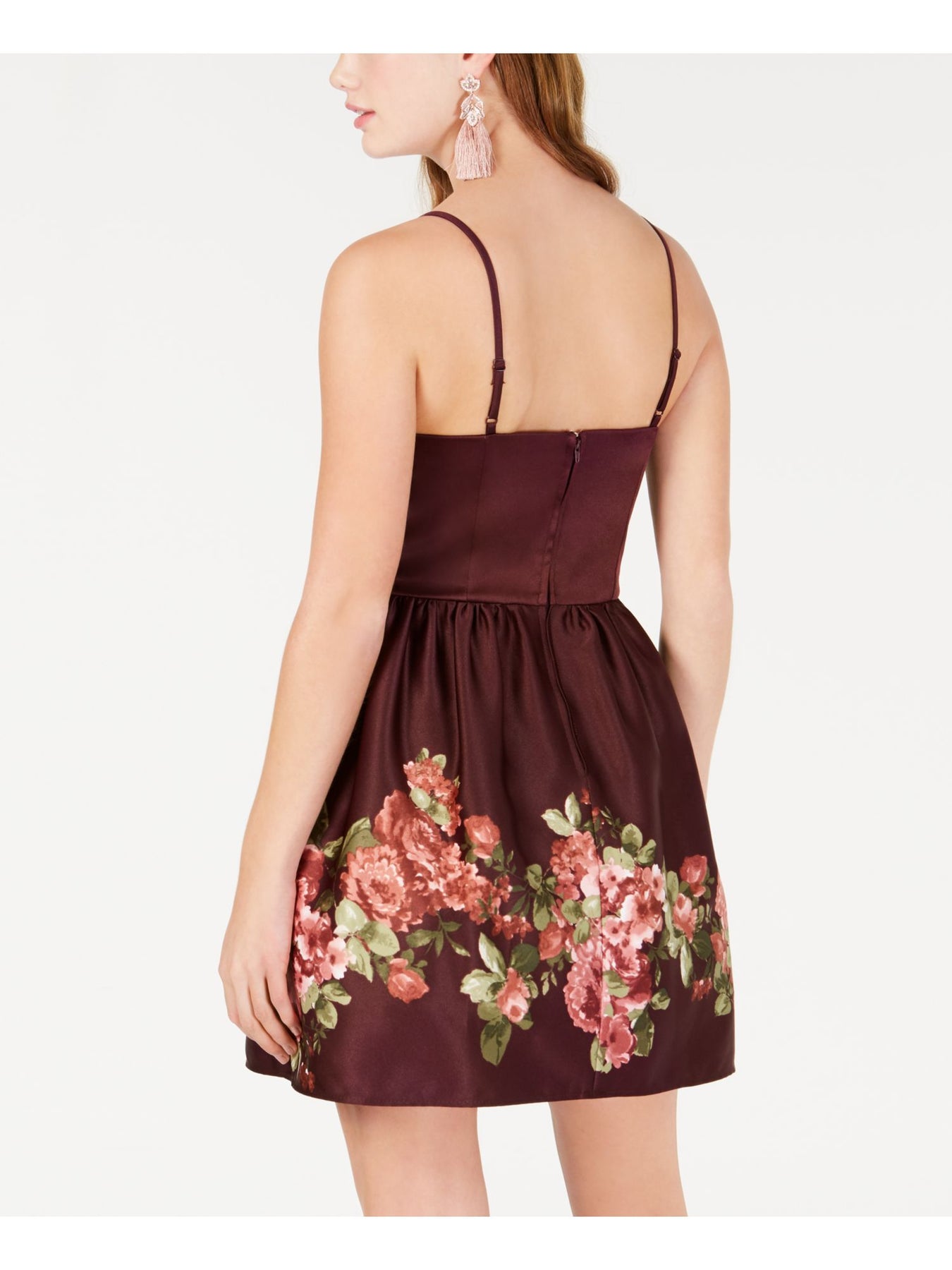Womens Burgundy Zippered Tie Floral Spaghetti Strap Sweetheart Neckline Mini Cocktail Fit + Flare Dress