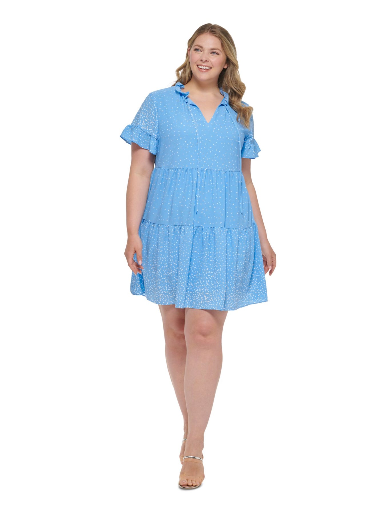 DKNY Womens Baby Doll Above The Knee Dress Light Blue Ruffled Textured Flutter Sleeve Split Polka Dot Tiered Lined Pullover Plus 20W