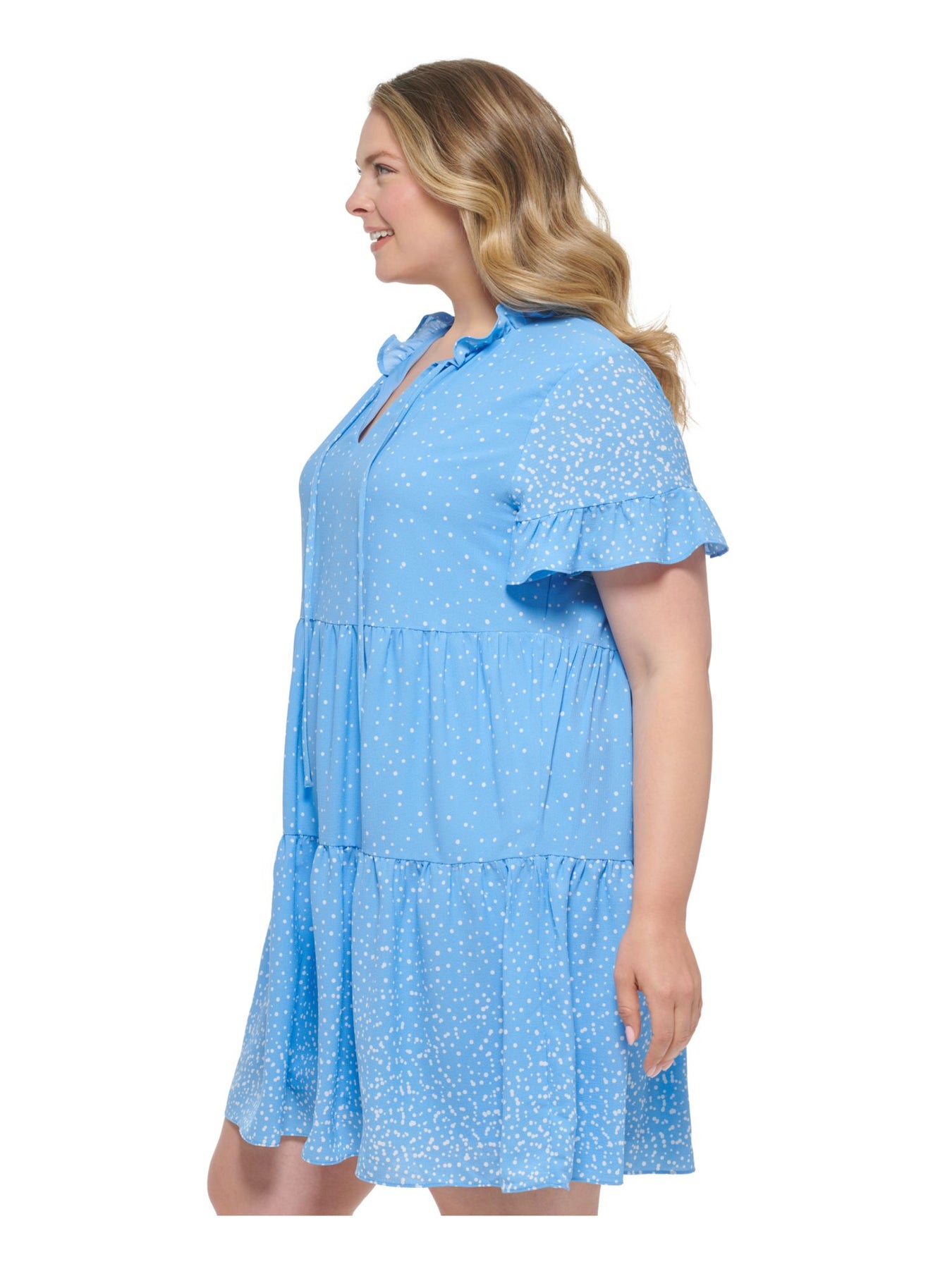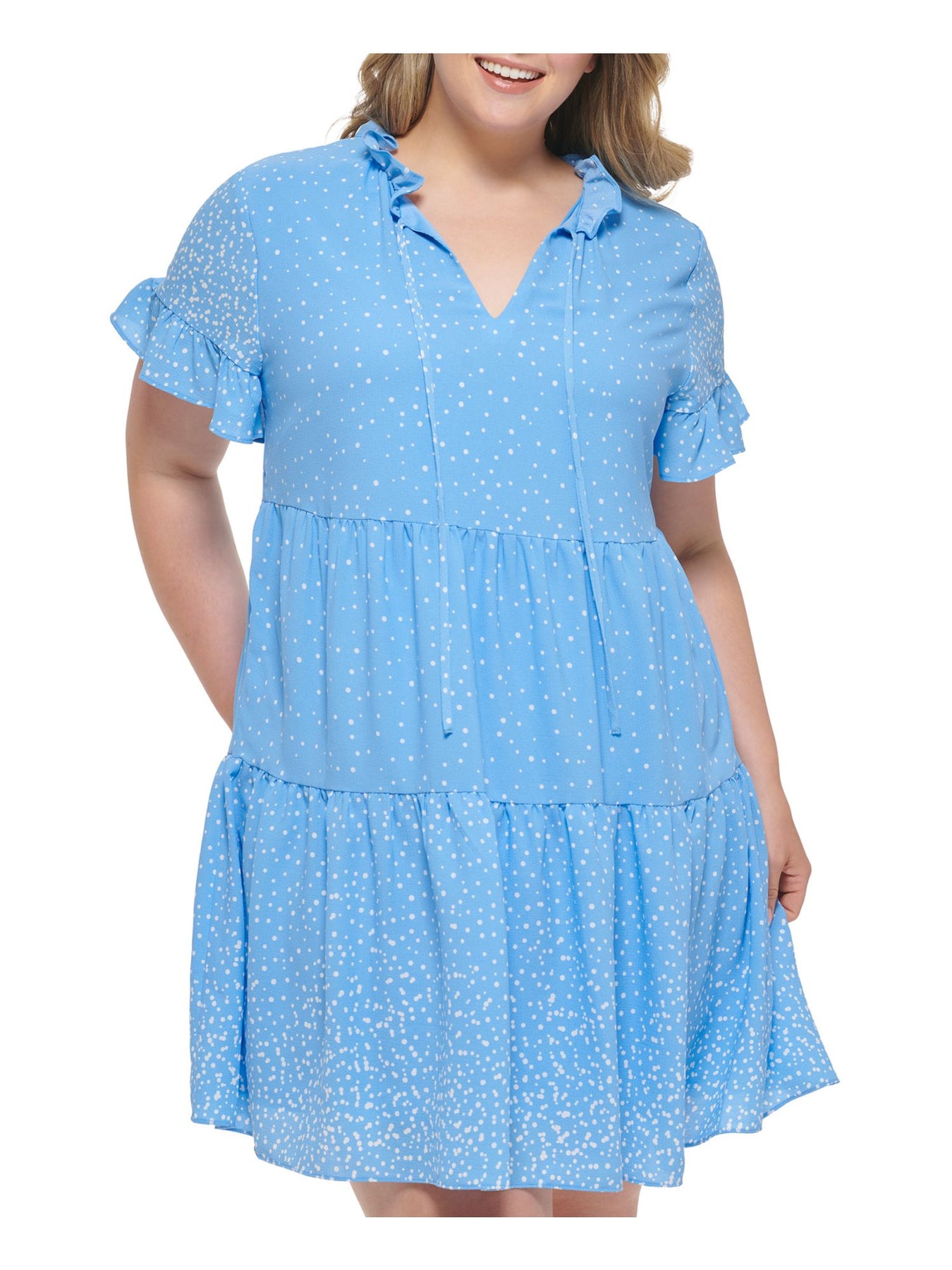 DKNY Womens Baby Doll Above The Knee Dress Blue Ruffled Textured Flutter Sleeve Split Polka Dot Tiered Lined Pullover Plus 18W