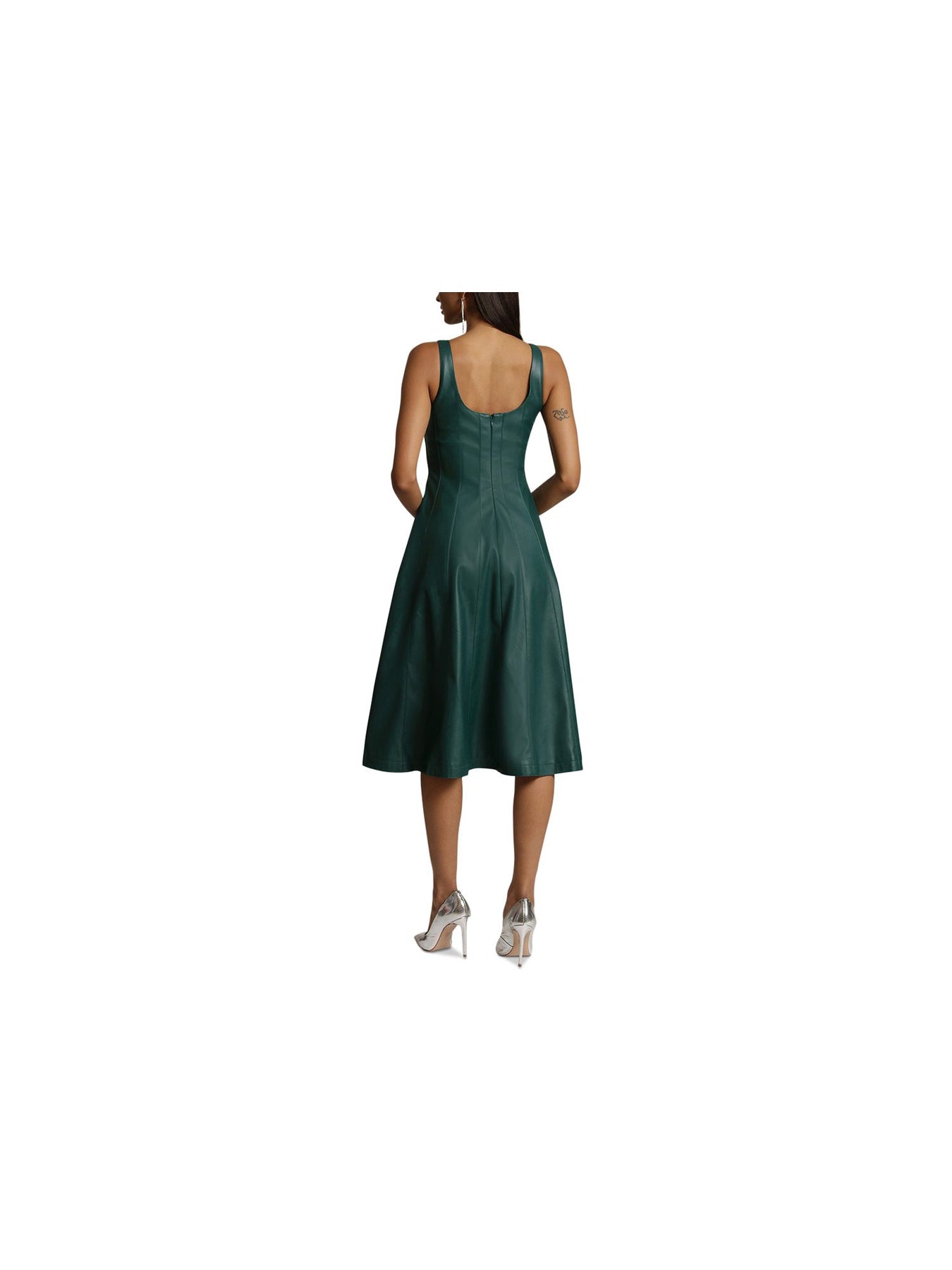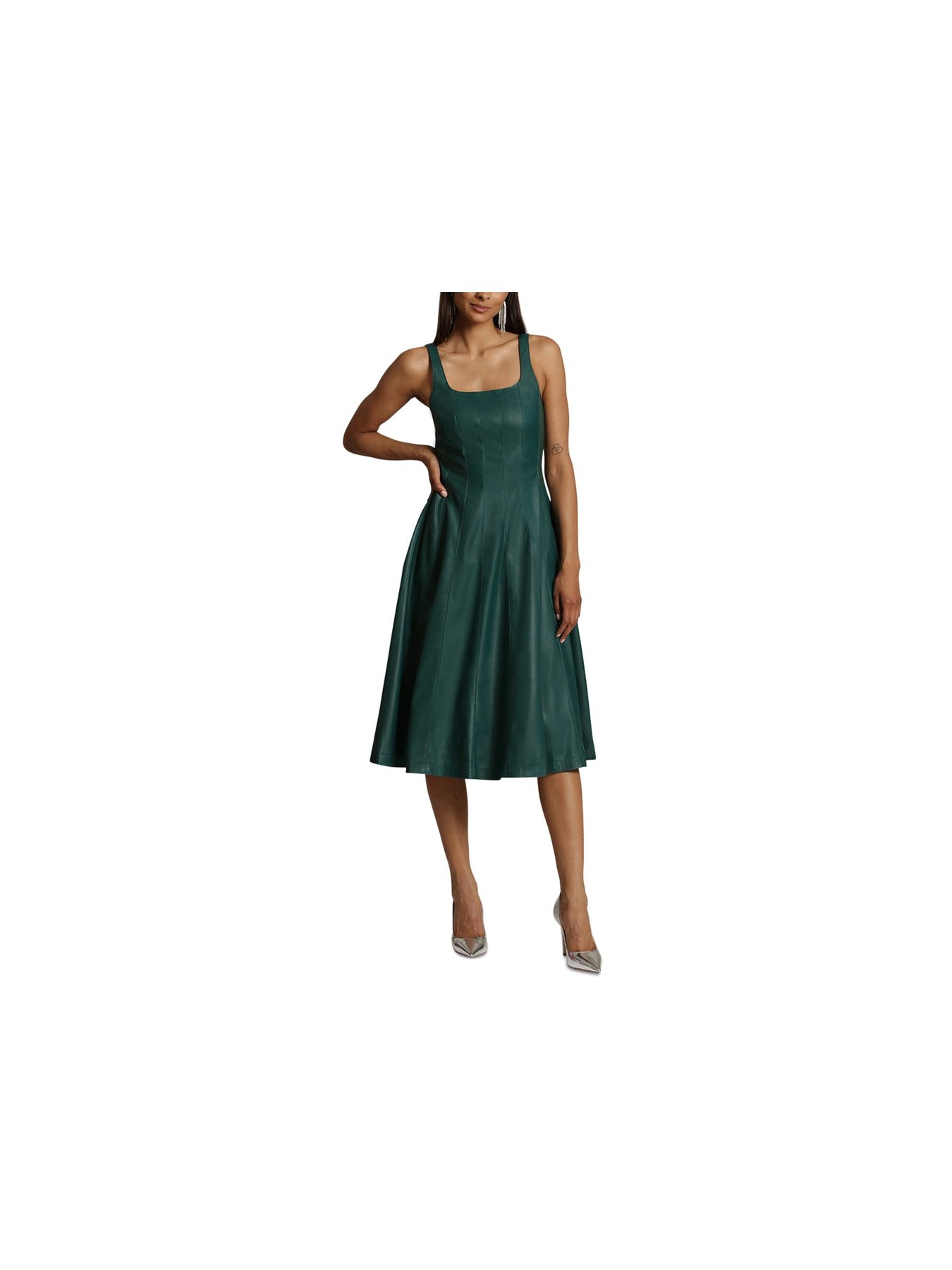 Womens Green Faux Leather Zippered Lined Seamed Detailing Scoop Back Sleeveless Square Neck Below The Knee Party Fit + Flare Dress