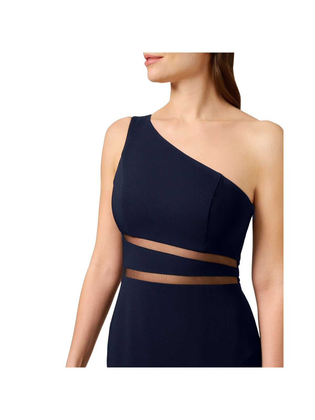 LIV FOSTER Womens Gown Full-Length Dress Navy Zippered Slitted Sleeveless Asymmetrical Neckline Evening Solid Mesh Inset Waist Lined 0