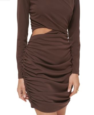 Womens Brown Ruched Cut Out Zippered Long Sleeve Round Neck Short Party Body Con Dress