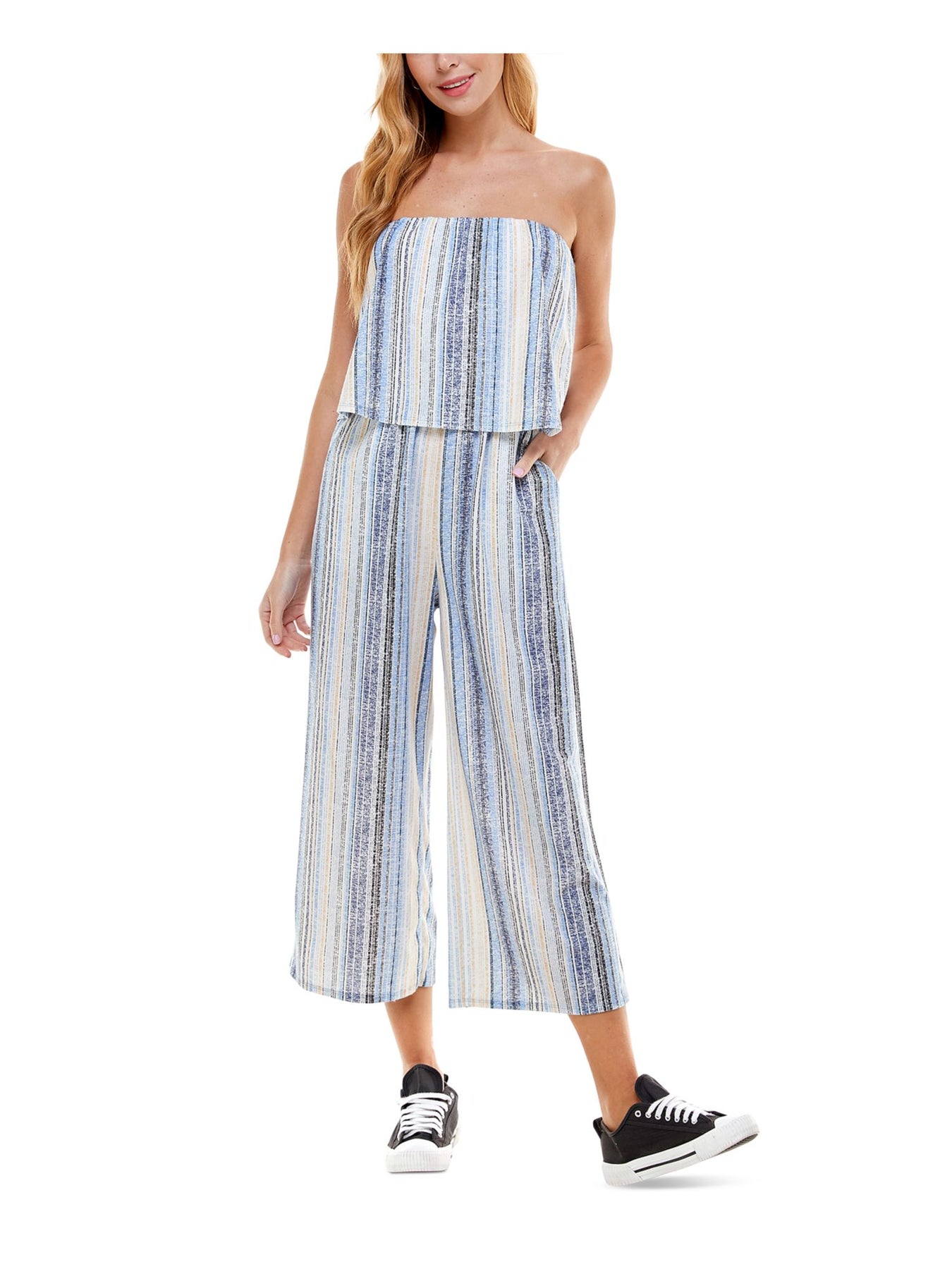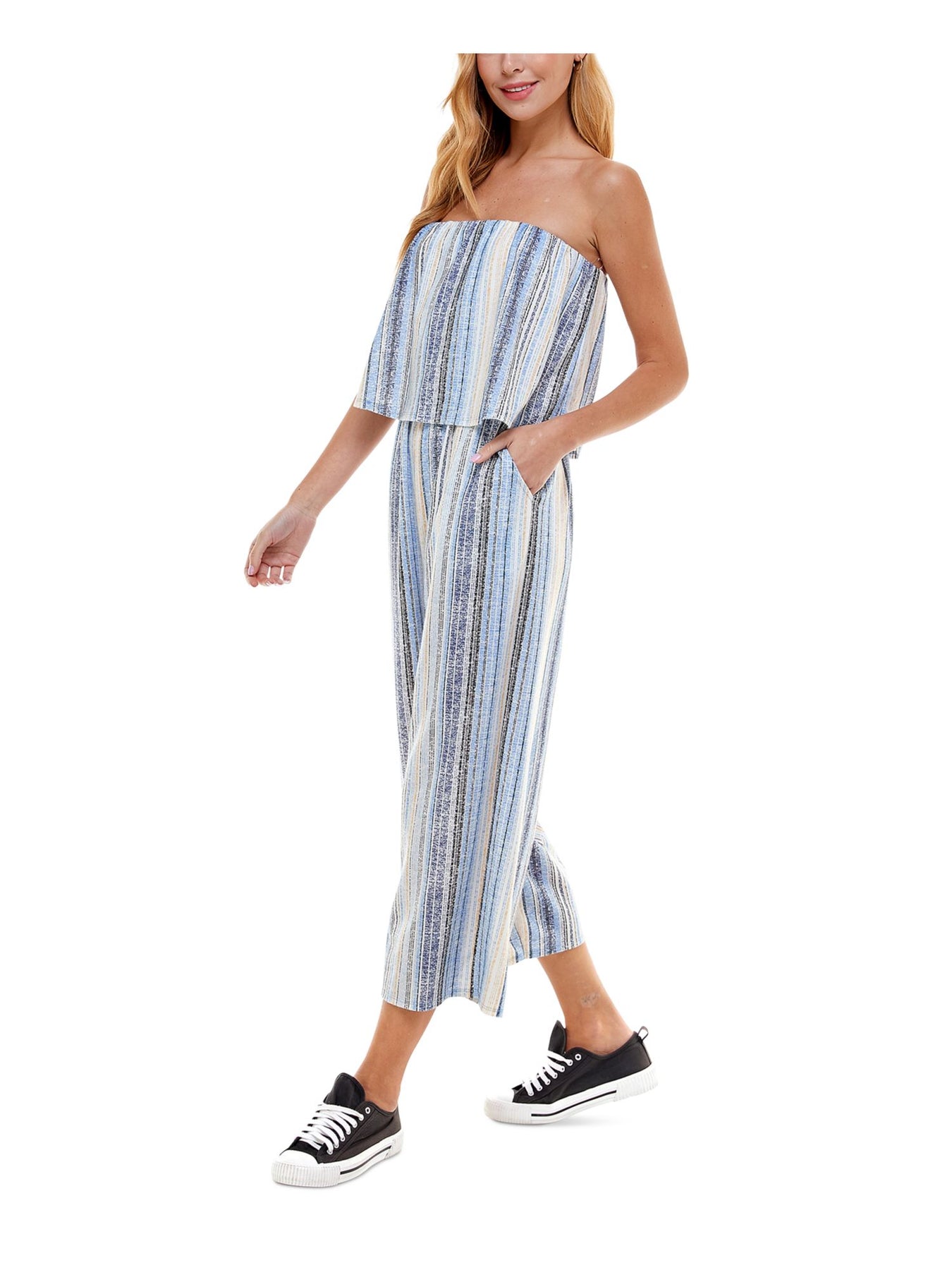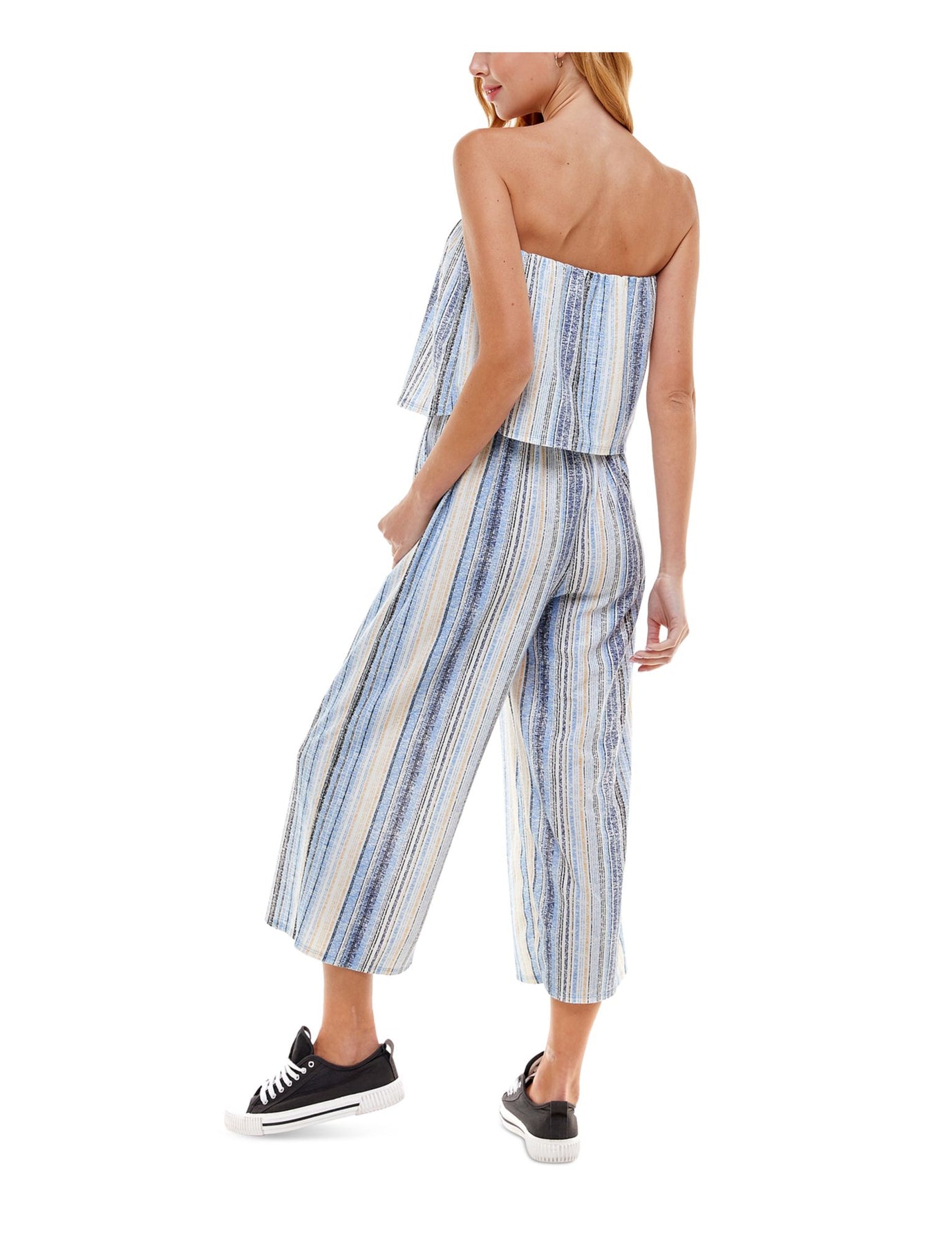 Womens Light Blue Ruffled Gaucho Striped Sleeveless Strapless Cropped Jumpsuit