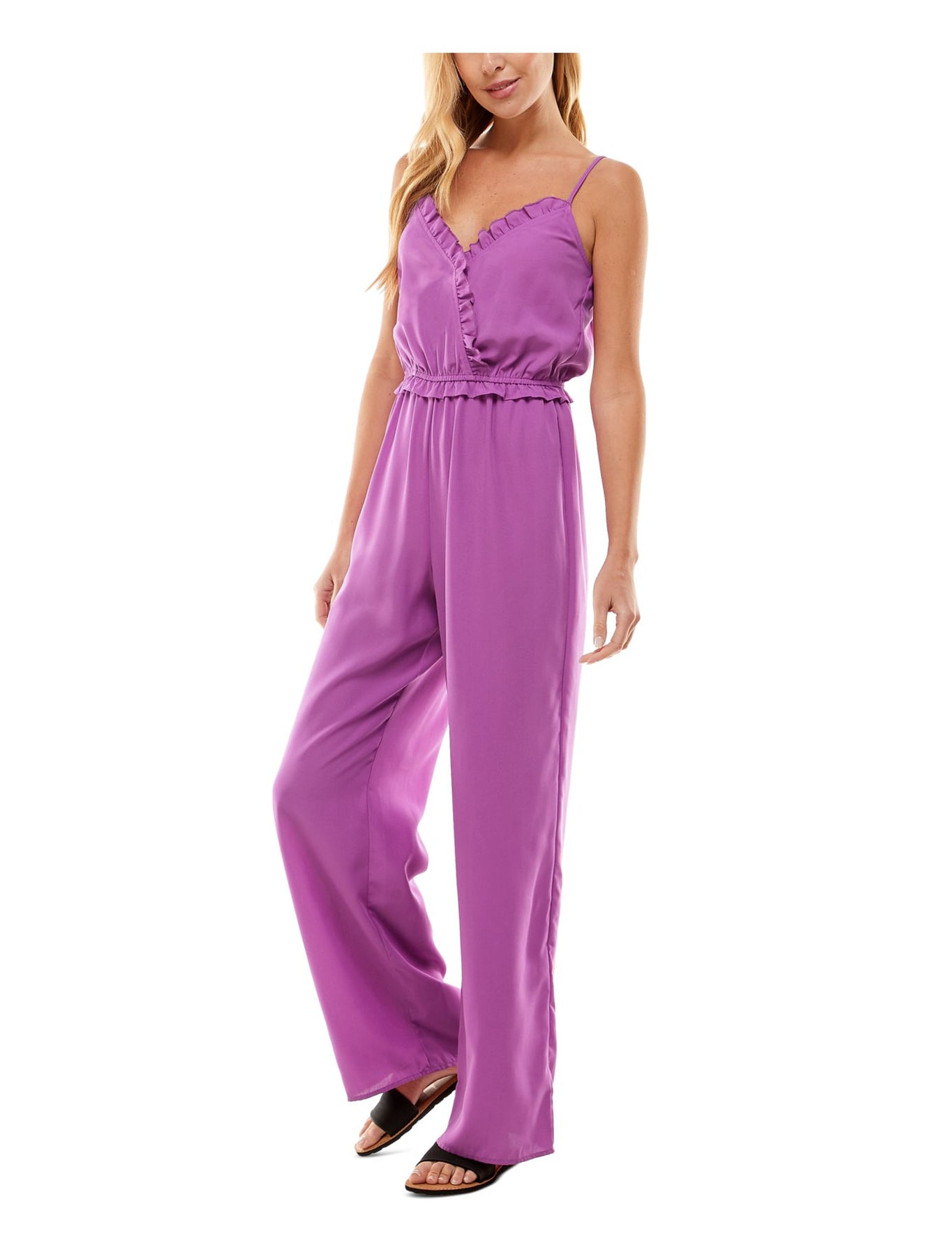 KINGSTON GREY Womens Purple Ruffled Adjustable Spaghetti Strap Surplice Neckline Wide Leg Jumpsuit S