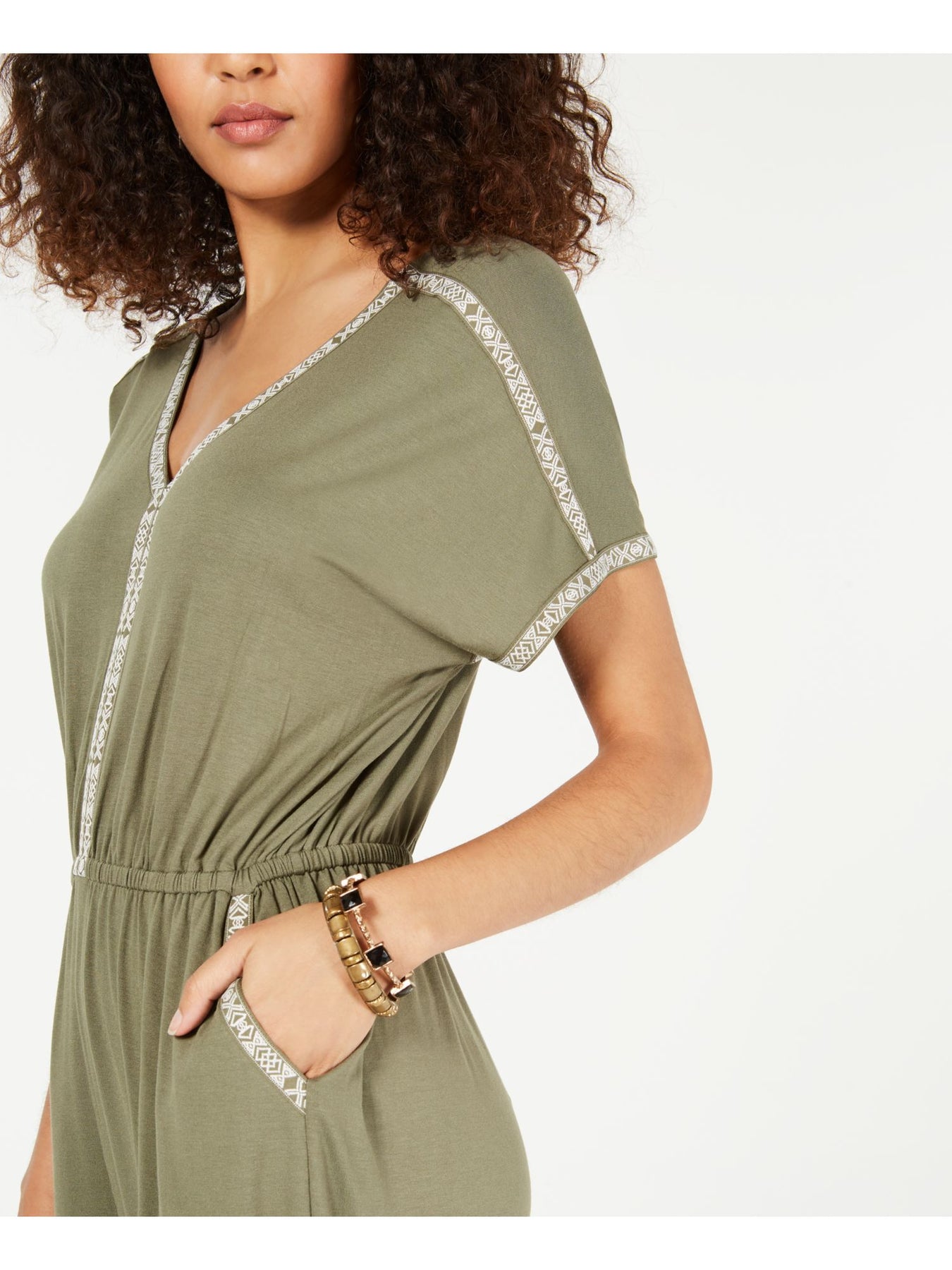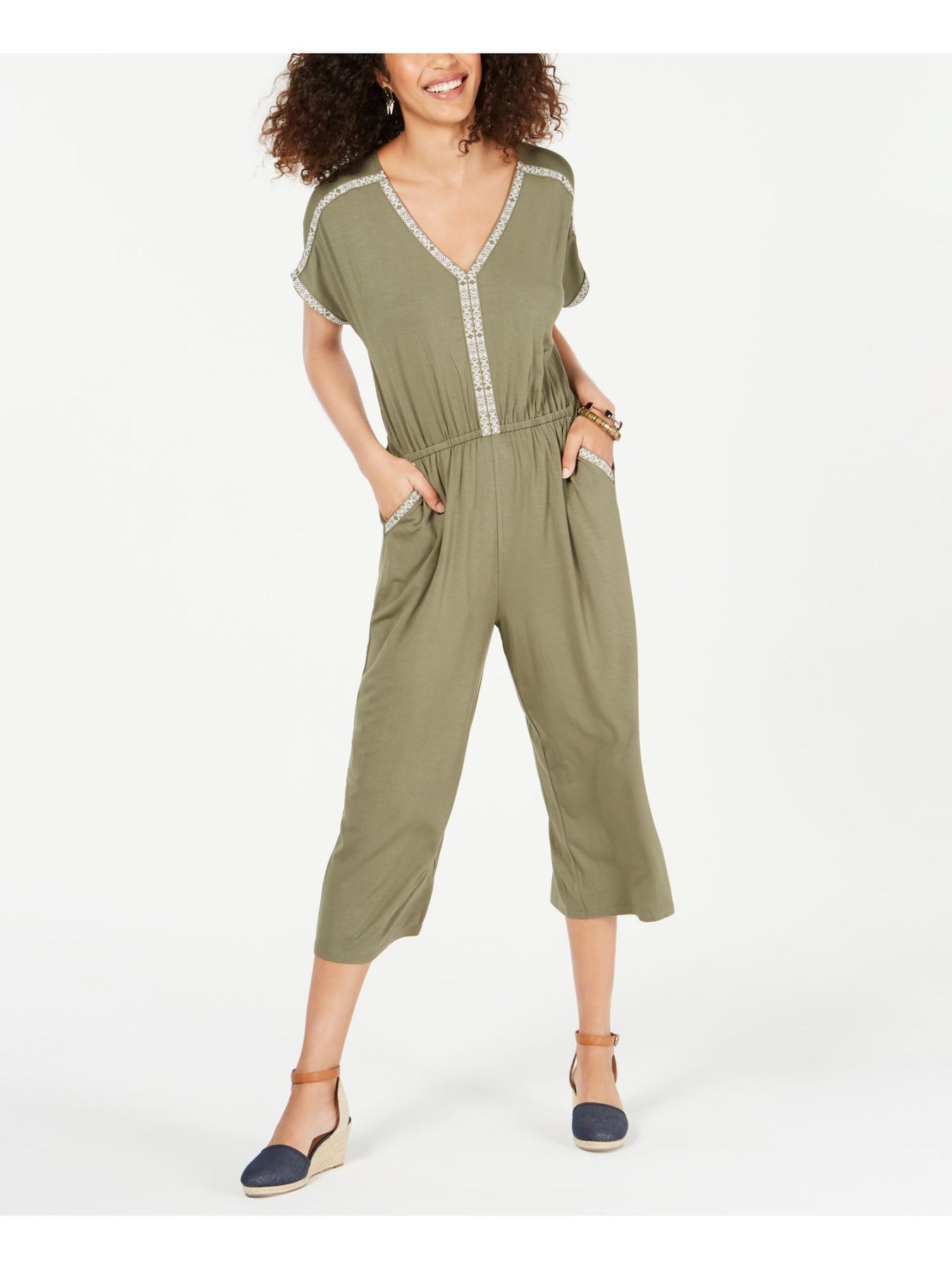 STYLE & COMPANY Womens Embroidered Pocketed Short Sleeve V Neck Straight Leg Jumpsuit