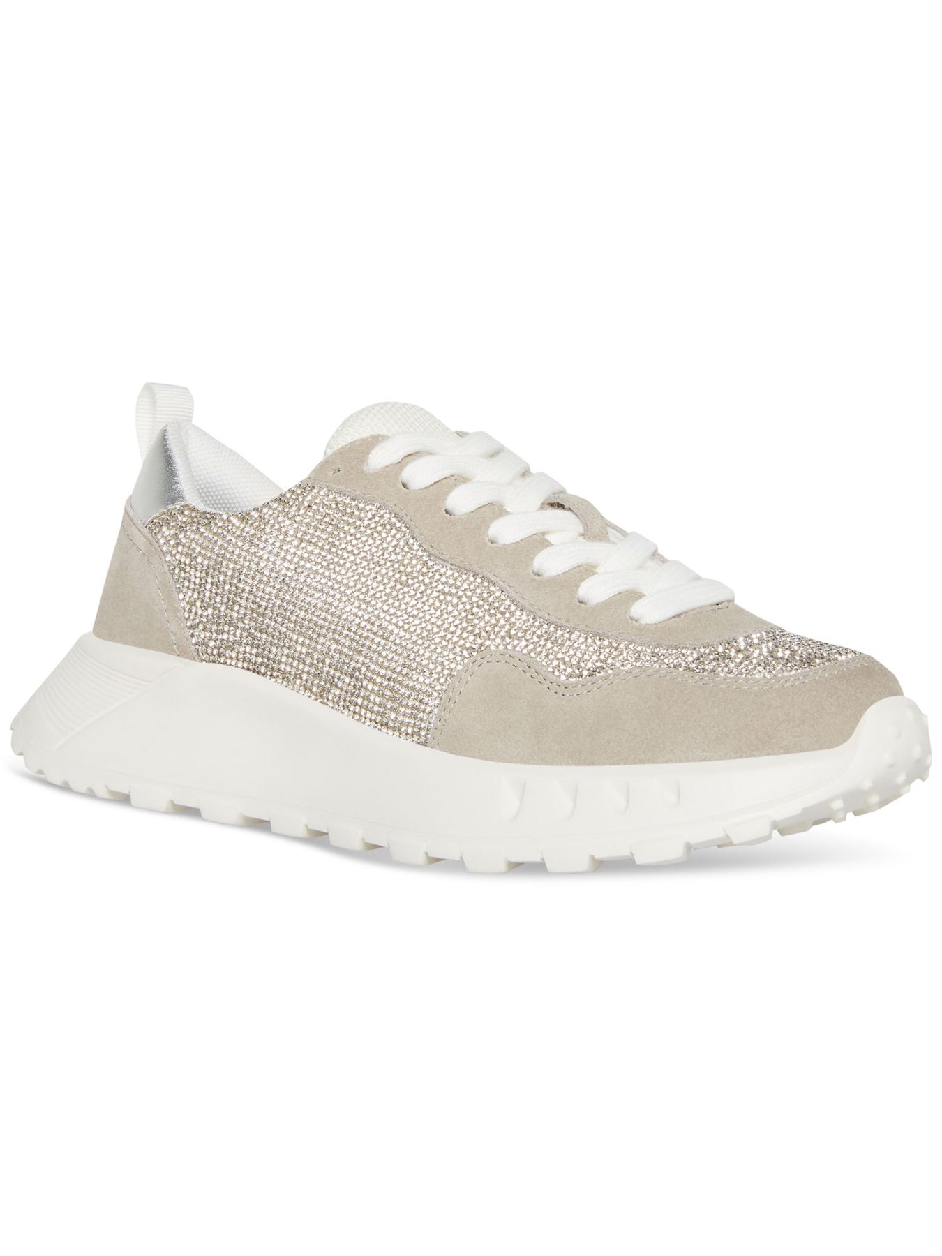 Womens Silver Mixed Media Rhinestone Heel Pull-Tab Waterproof Slip Resistant Cushioned Luster Round Toe Wedge Lace-Up Sneakers Shoes M