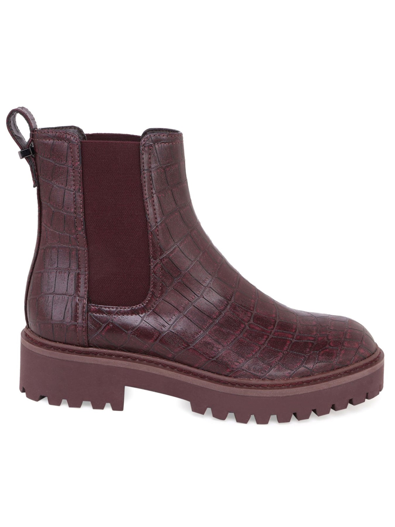 Womens Burgundy Snake Skin Lug Sole Salt Round Toe Block Heel Slip On Chelsea Boot