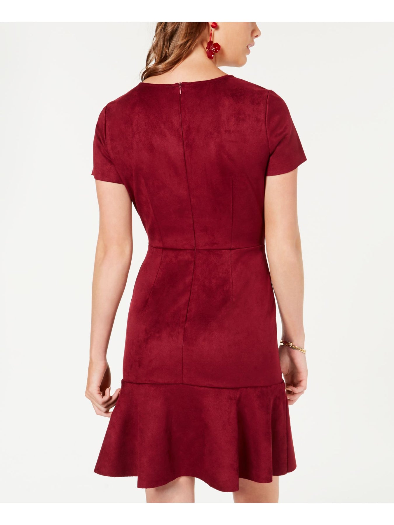 Rosie Harlow Womens Burgundy Faux Suede Short Sleeve Jewel Neck Short Sheath Dress XXS
