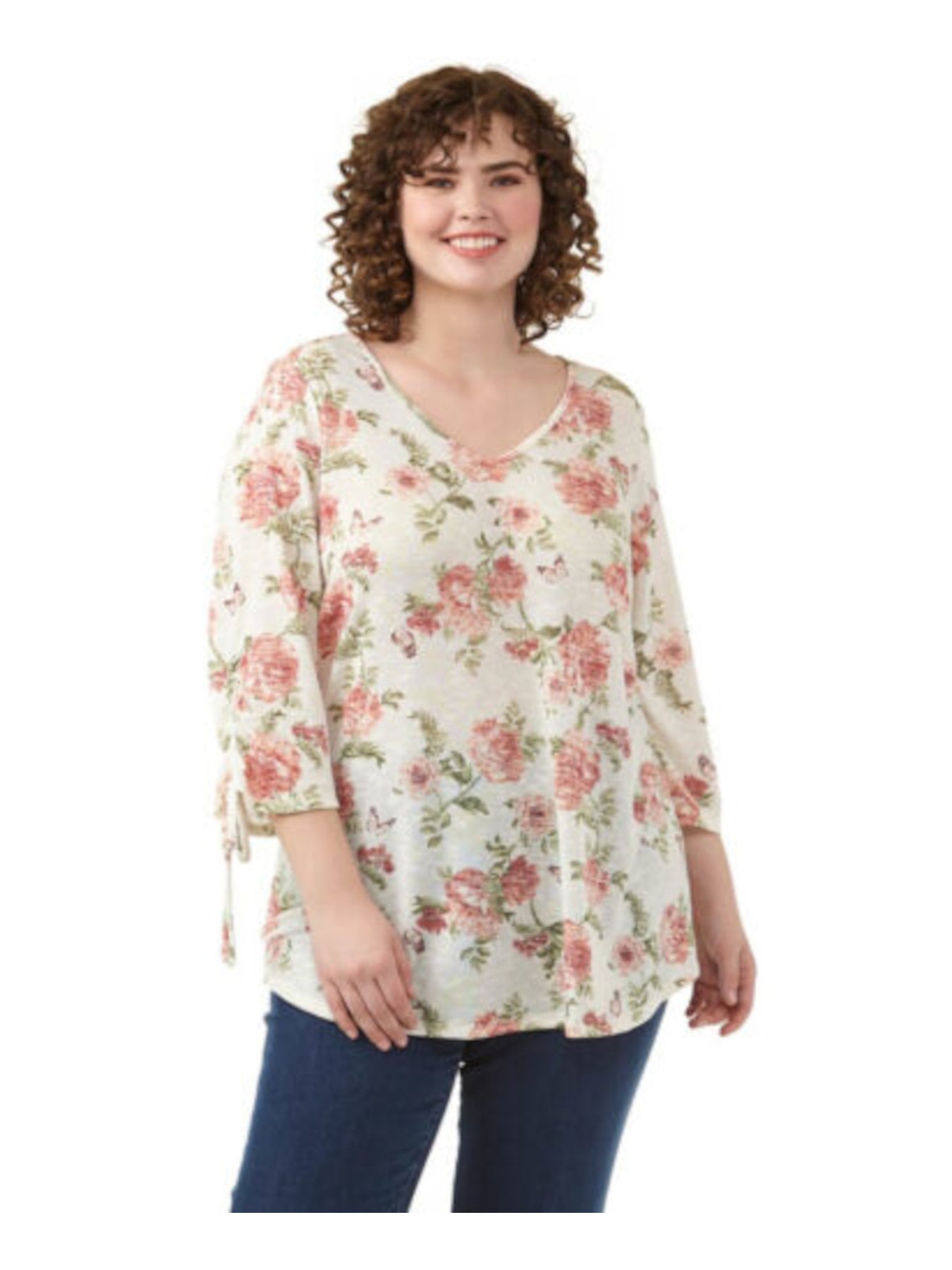 STATUS BY CHENAULT Womens Ivory Stretch Floral V Neck Top Plus 3X