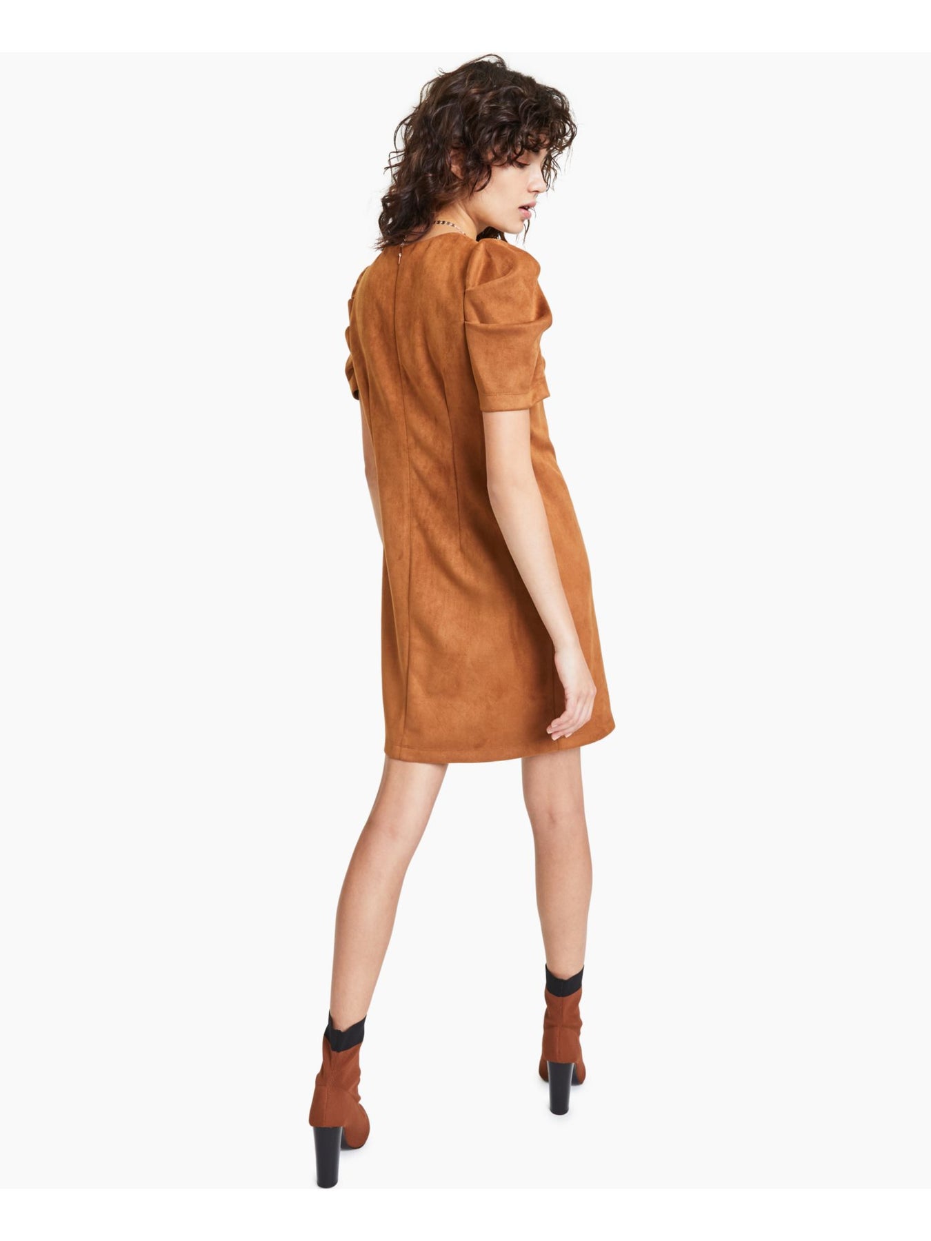 BAR III Womens Brown Zippered Pouf Sleeve Round Neck Above The Knee Party Shift Dress XS