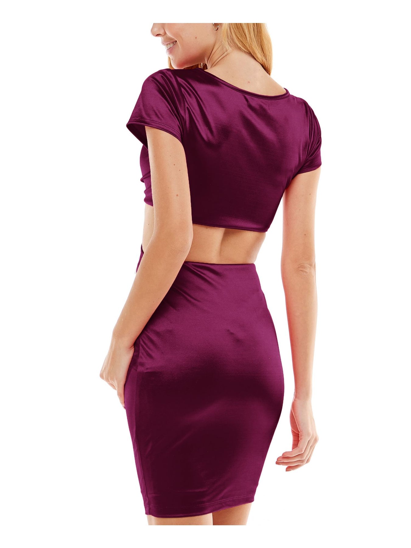 CITY STUDIO Womens Burgundy Cut Out Gathered Satin Plunge Pullover Style Short Sleeve V Neck Above The Knee Party Body Con Dress XS