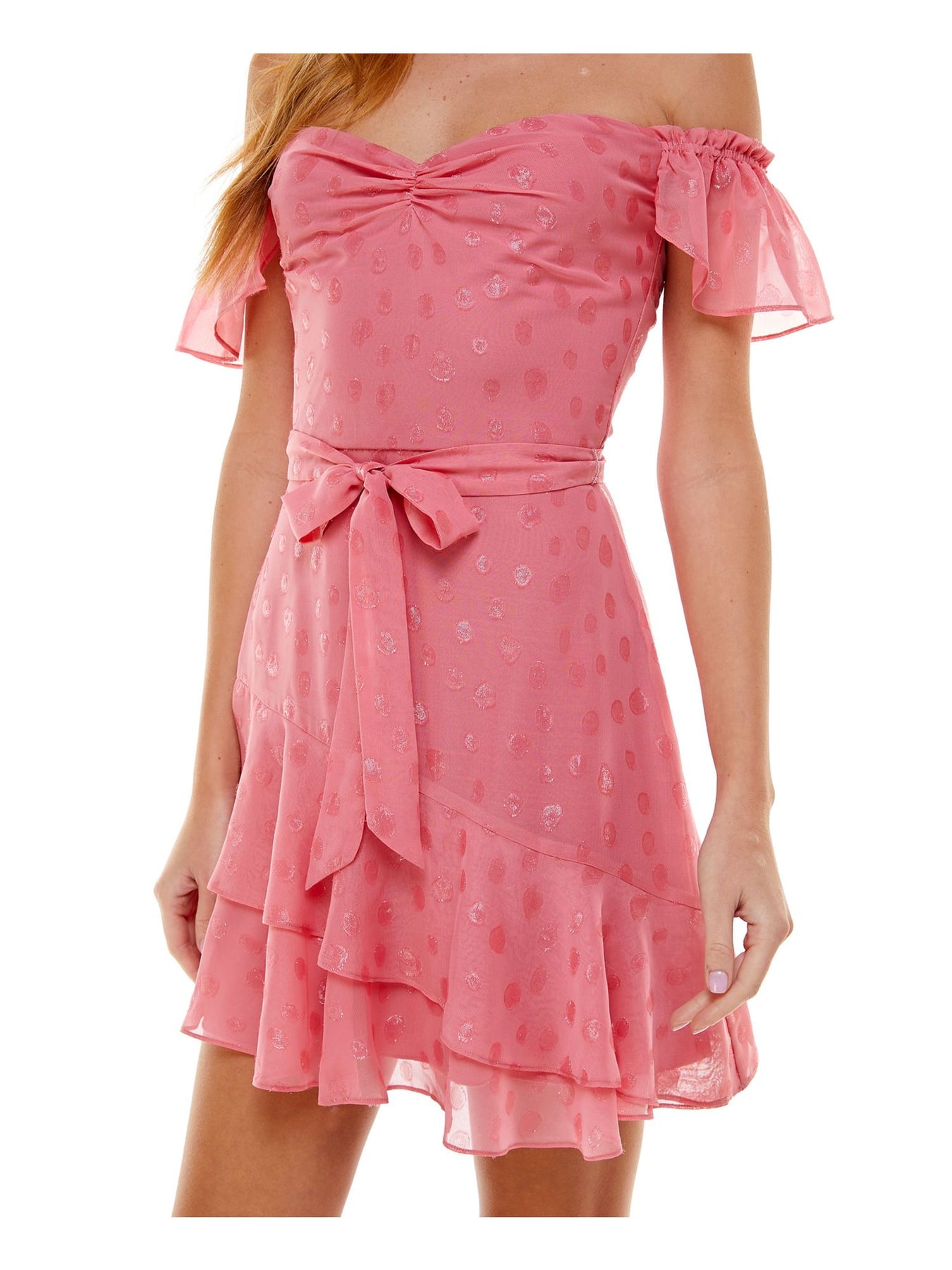 CITY STUDIO Womens Pink Zippered Ruffled Ruched Layered Tie Polka Dot Flutter Sleeve Off Shoulder Short Party Fit + Flare Dress 1