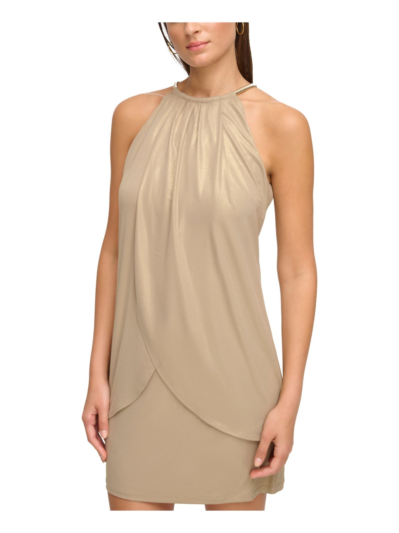 Womens Gold Ruched Lined Drape Front Sleeveless Halter Short Party Sheath Dress