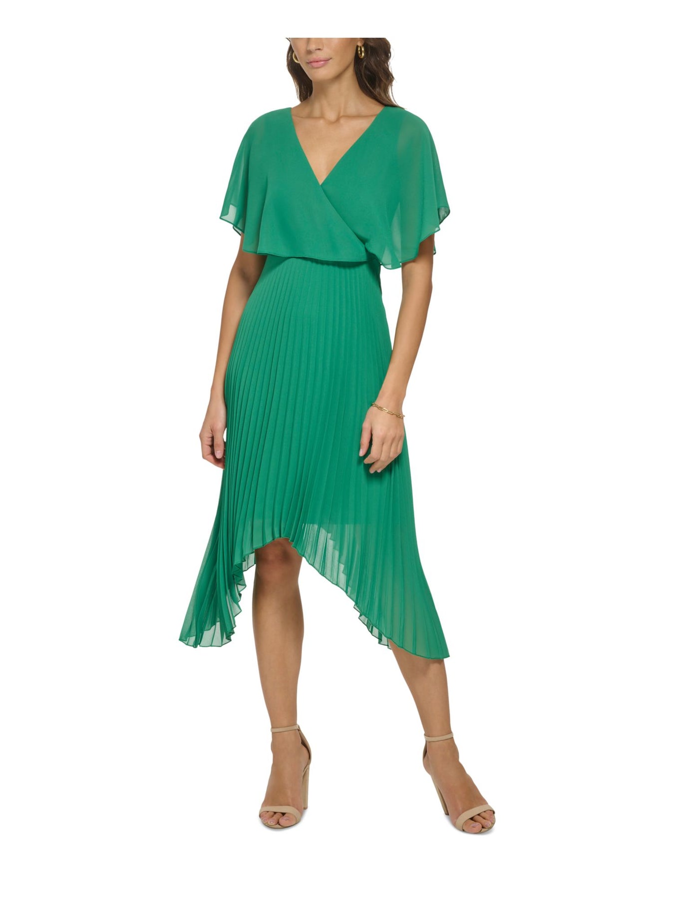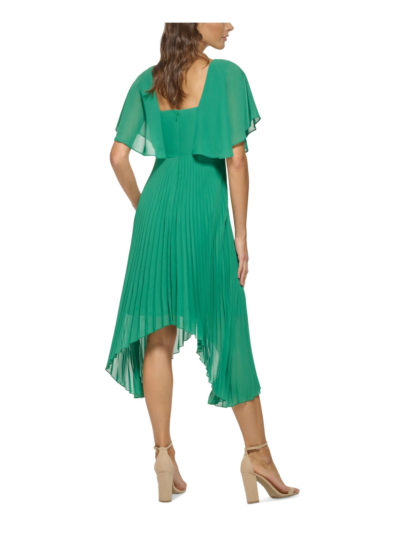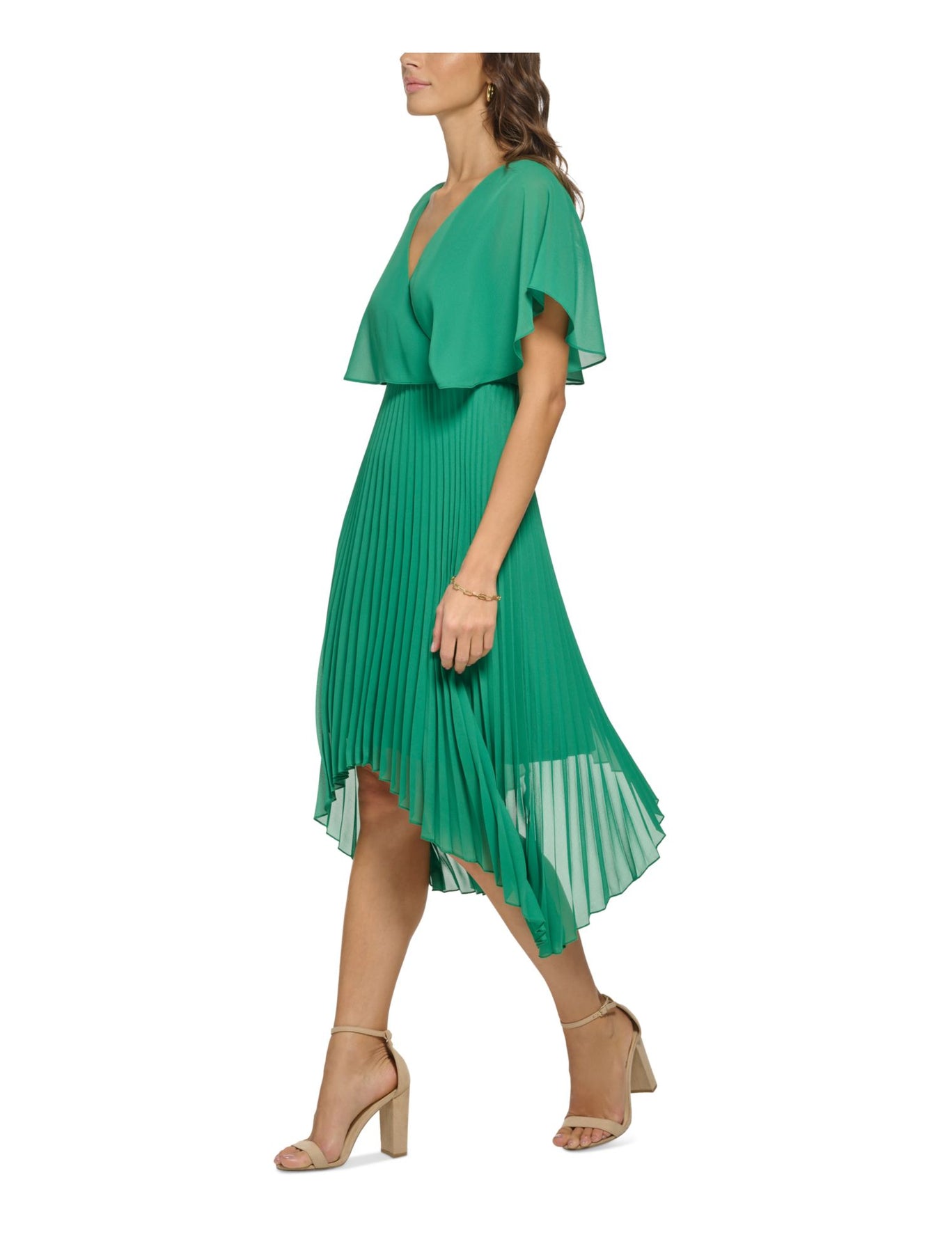 Womens Green Pleated Zippered Handkerchief Hem Sheer Lined Flutter Sleeve Surplice Neckline Midi Party Fit + Flare Dress
