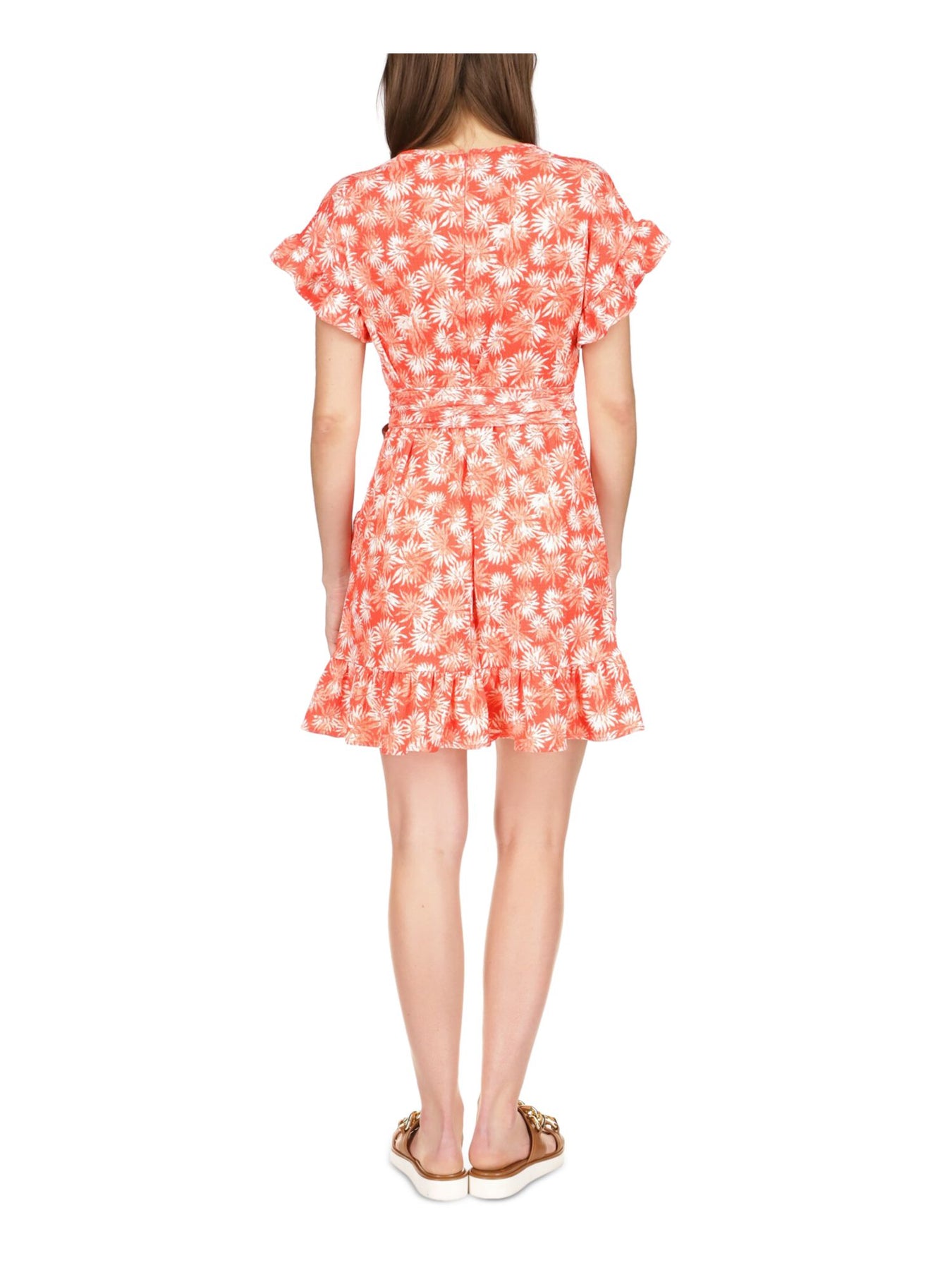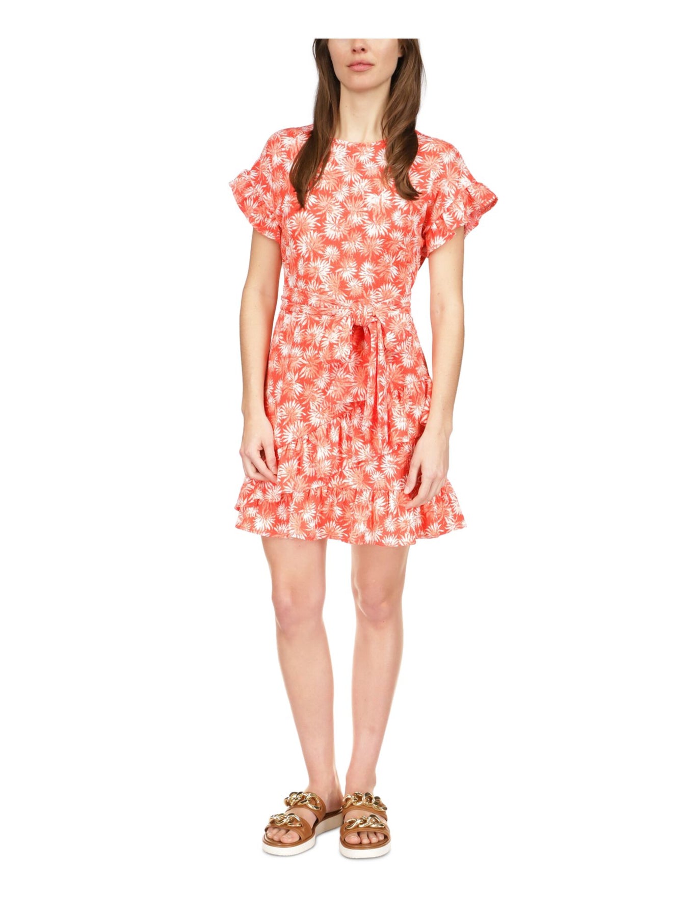 Womens Orange Zippered Textured Ruffled Tiered Tie Waist Printed Short Sleeve Round Neck Short Party Fit + Flare Dress