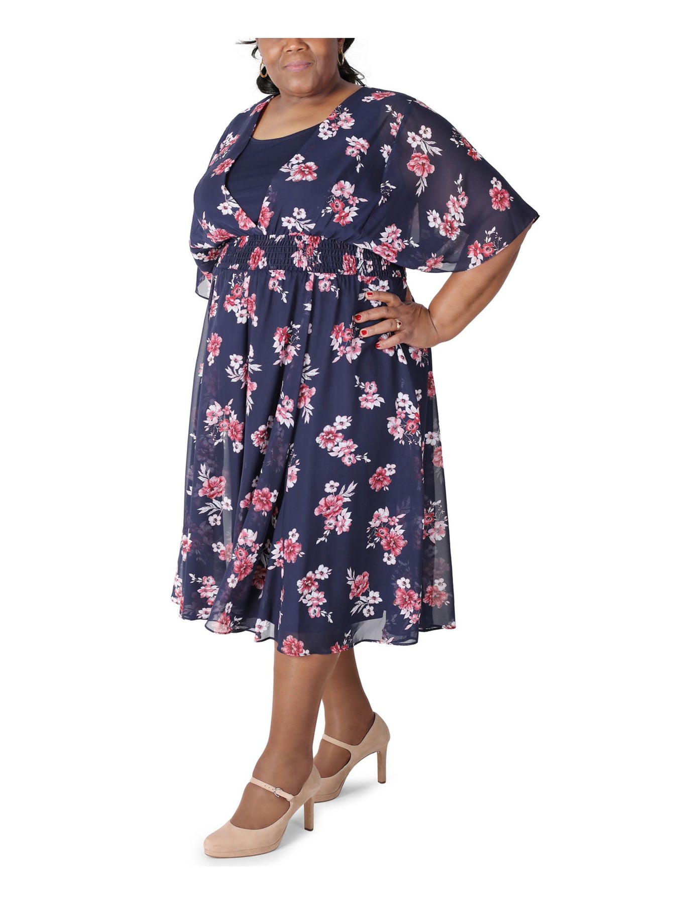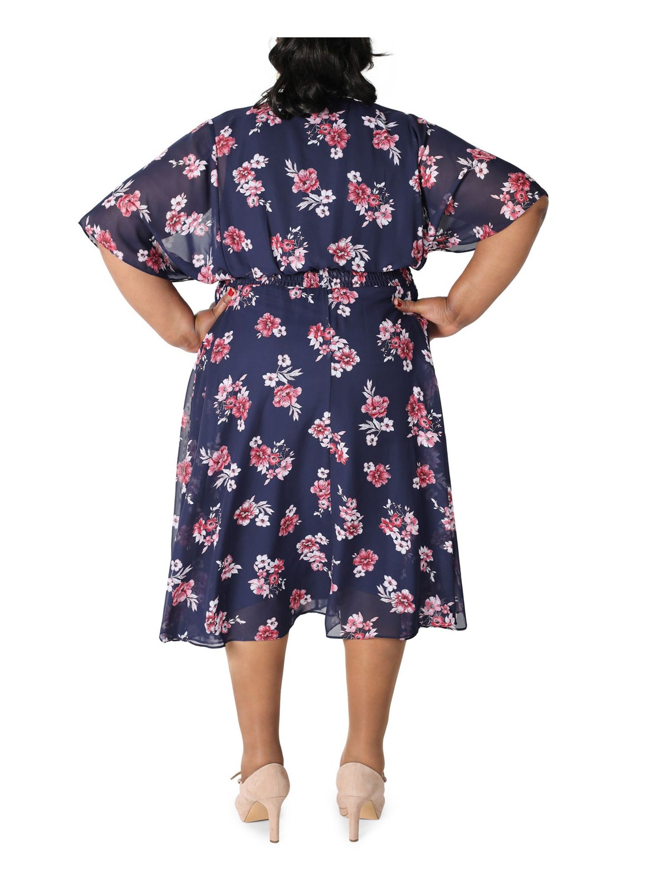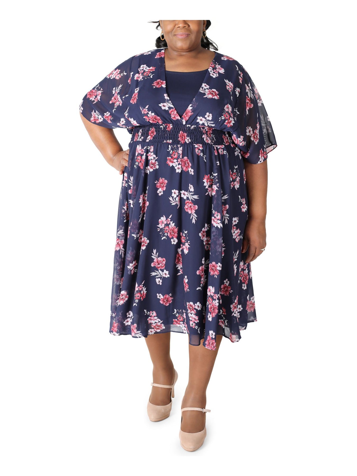 ROBBIE BEE Womens Navy Smocked Sheer Floral Elbow Sleeve Surplice Neckline Midi Party Fit + Flare Dress Plus S