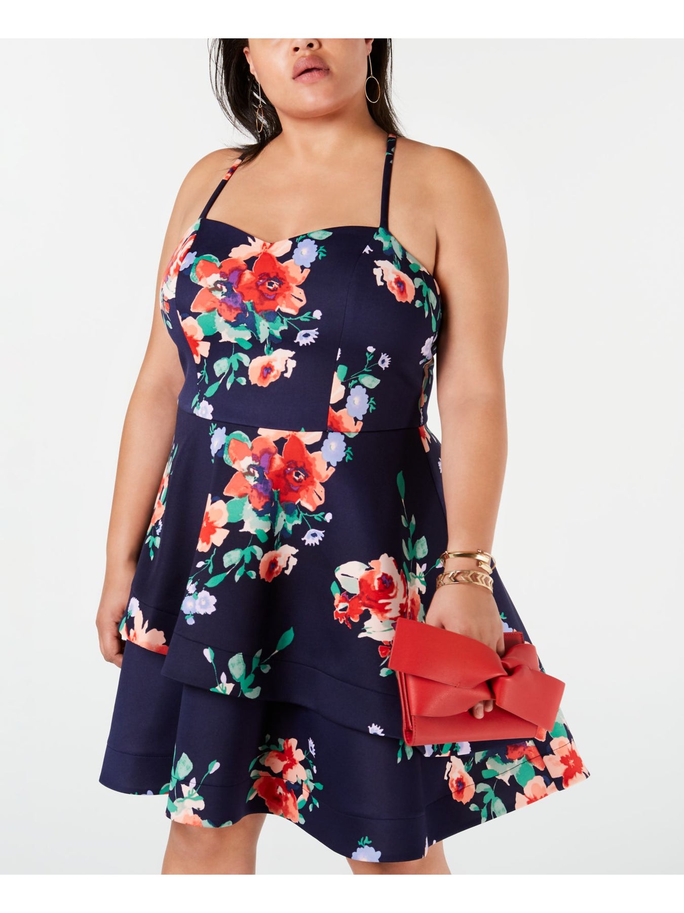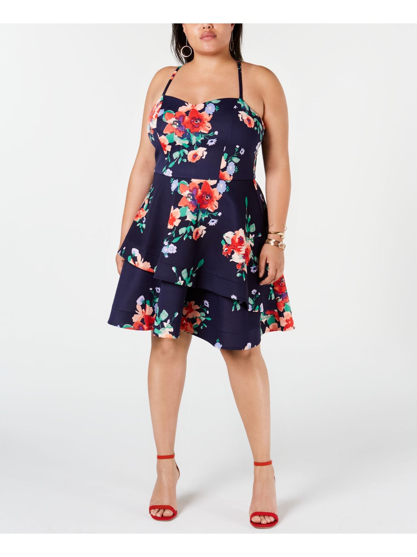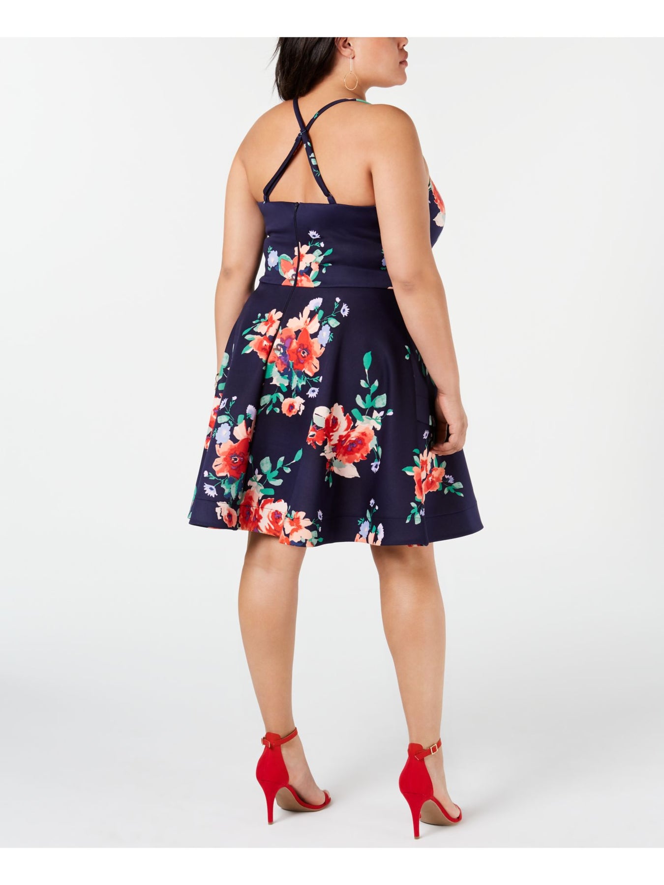 SEQUIN HEARTS Womens Navy Floral Spaghetti Strap Square Neck Knee Length Party Fit + Flare Dress 20
