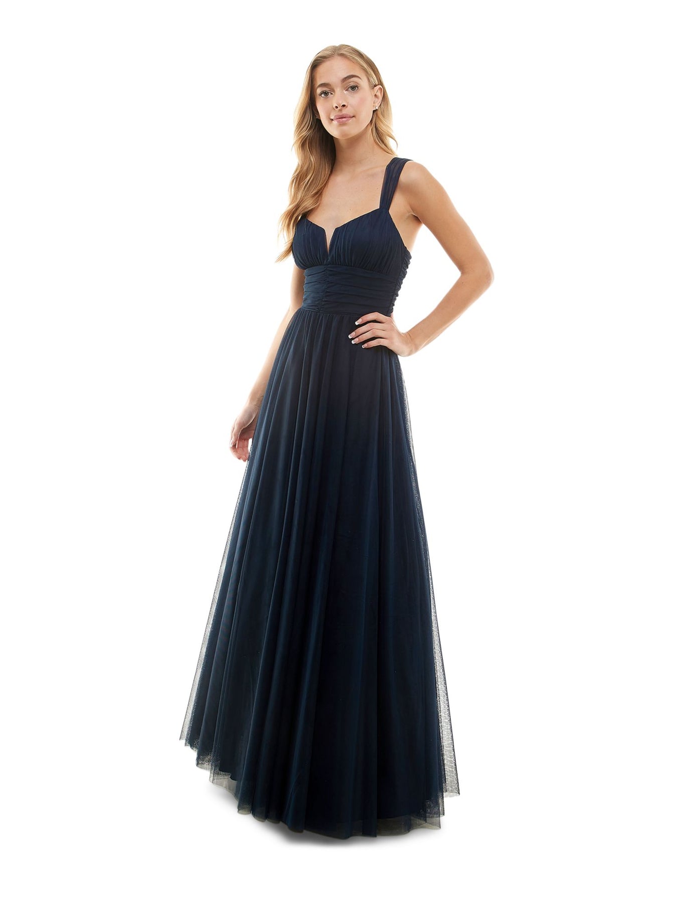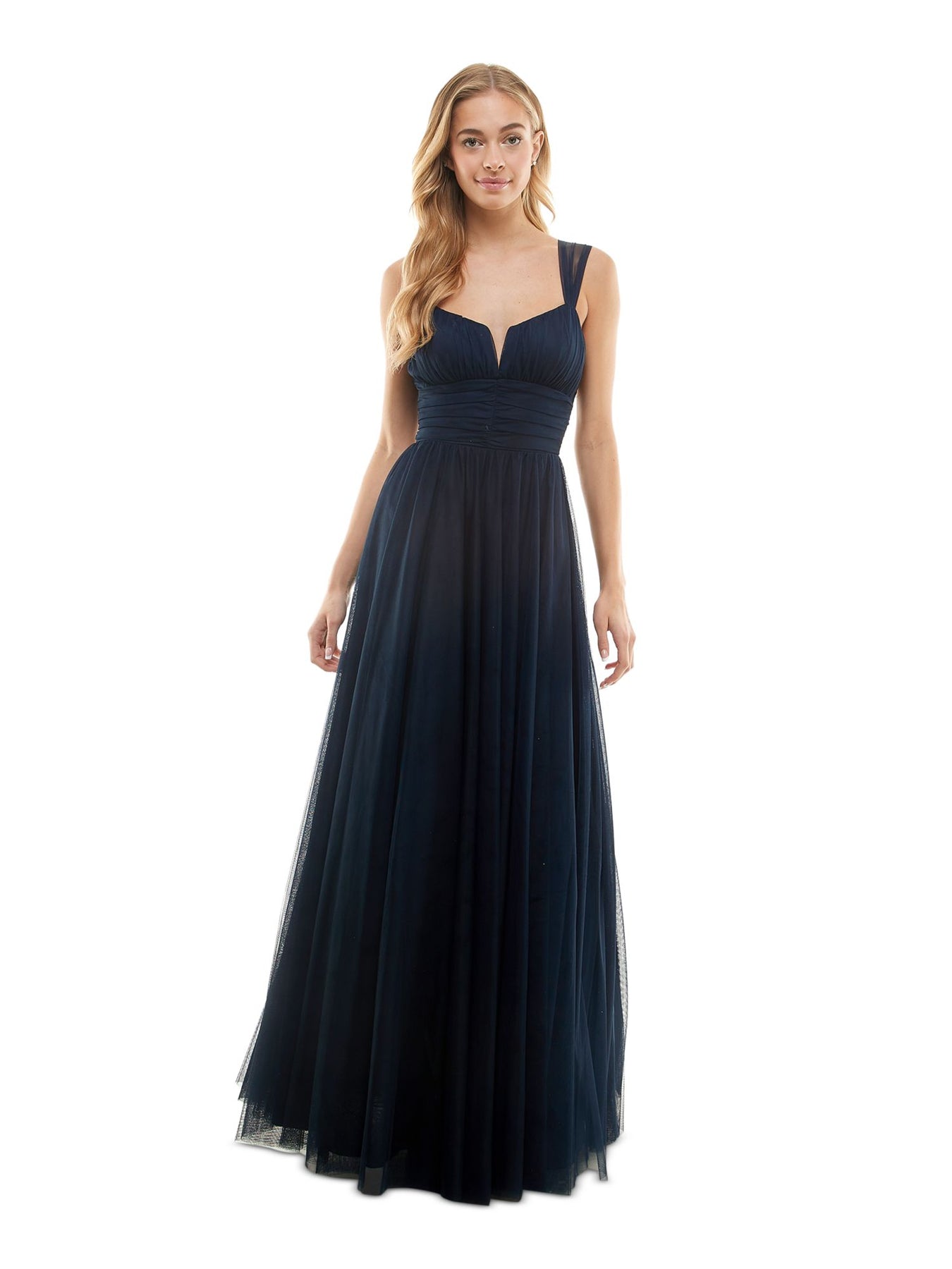 CITY STUDIO Womens Navy Zippered Pleated Lined Tulle Mesh Sleeveless V Neck Full-Length Gown Prom Dress 1