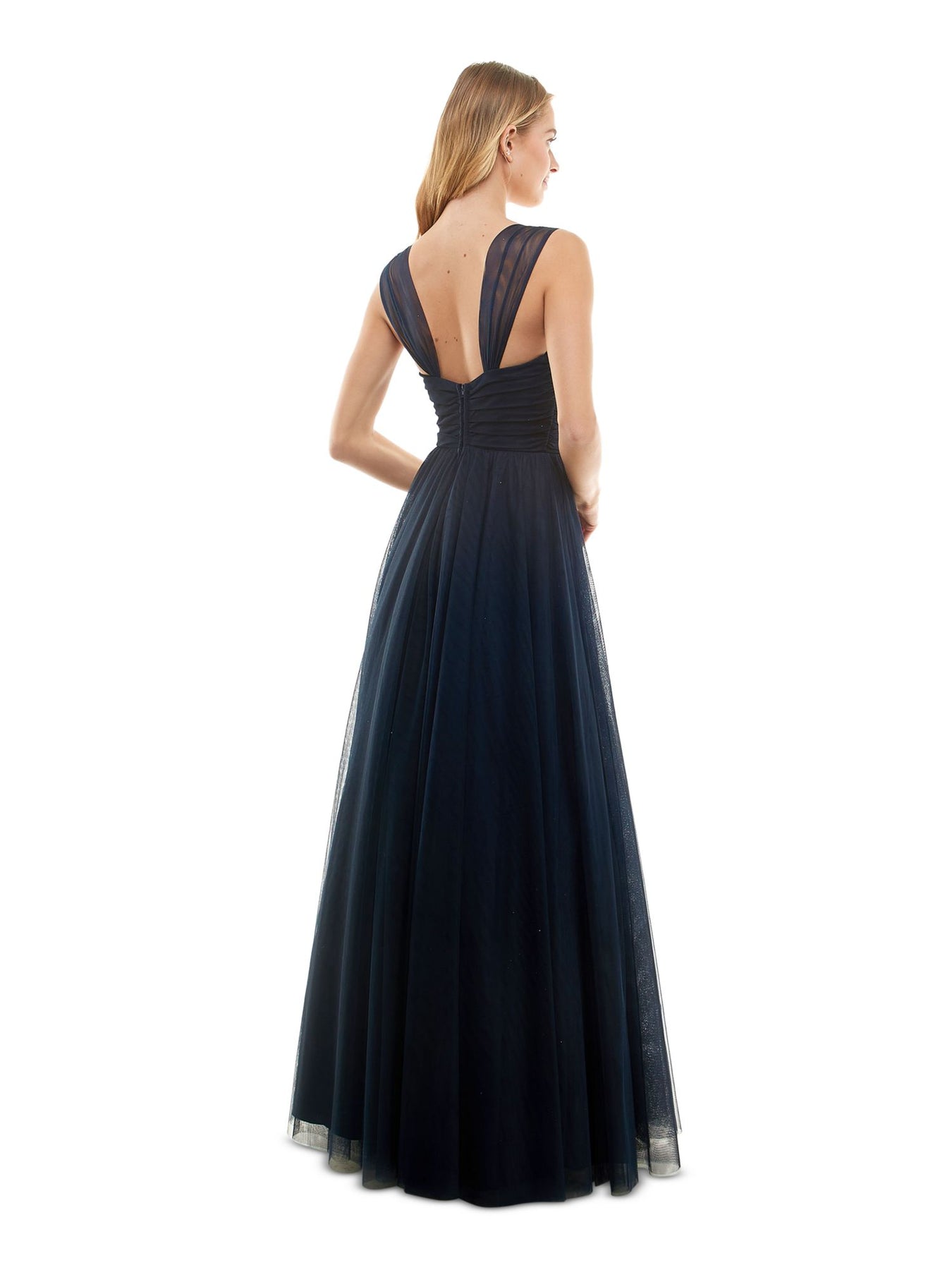 CITY STUDIO Womens Navy Zippered Pleated Lined Tulle Mesh Sleeveless V Neck Full-Length Gown Prom Dress 3