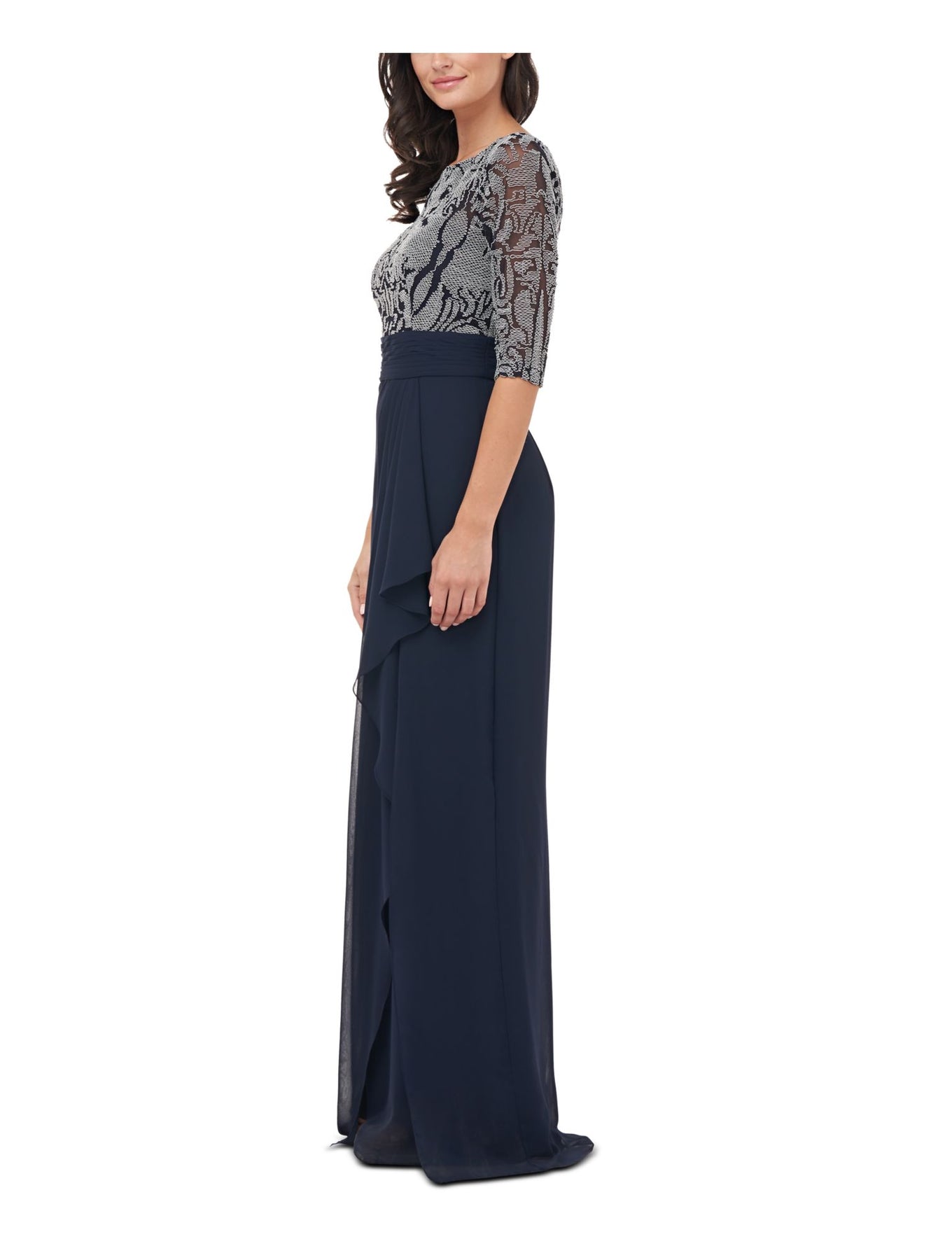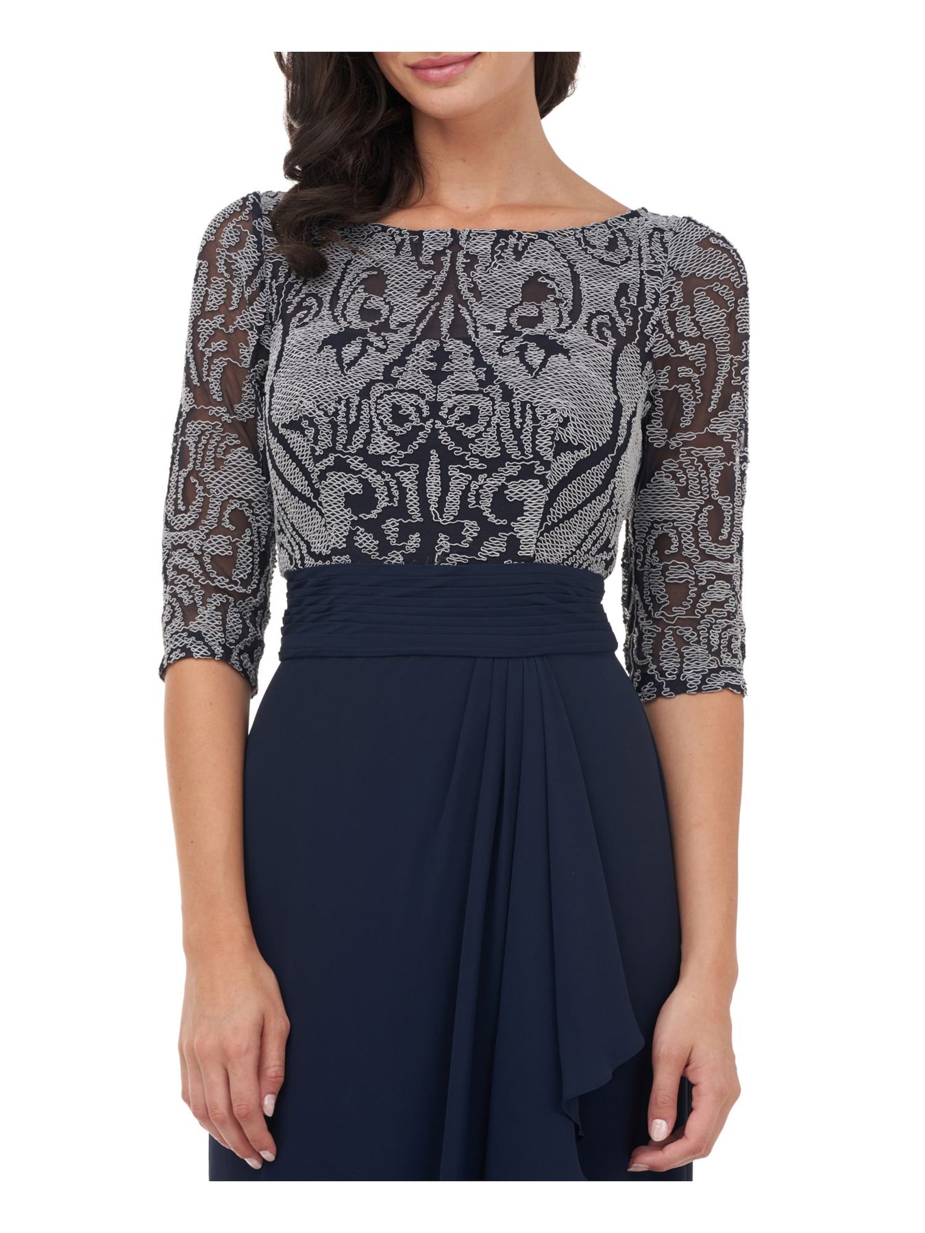 JS COLLECTION Womens Navy Stretch Zippered Pleated Faux Wrap Skirt Elbow Sleeve Boat Neck Full-Length Formal Gown Dress 4