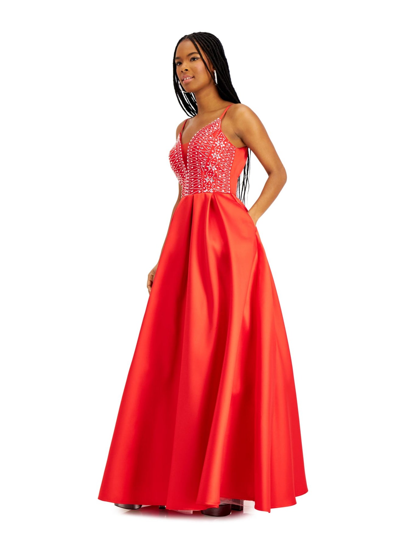 SAY YES TO THE PROM Womens Red Embellished Spaghetti Strap V Neck Full-Length Prom Fit + Flare Dress 1\2