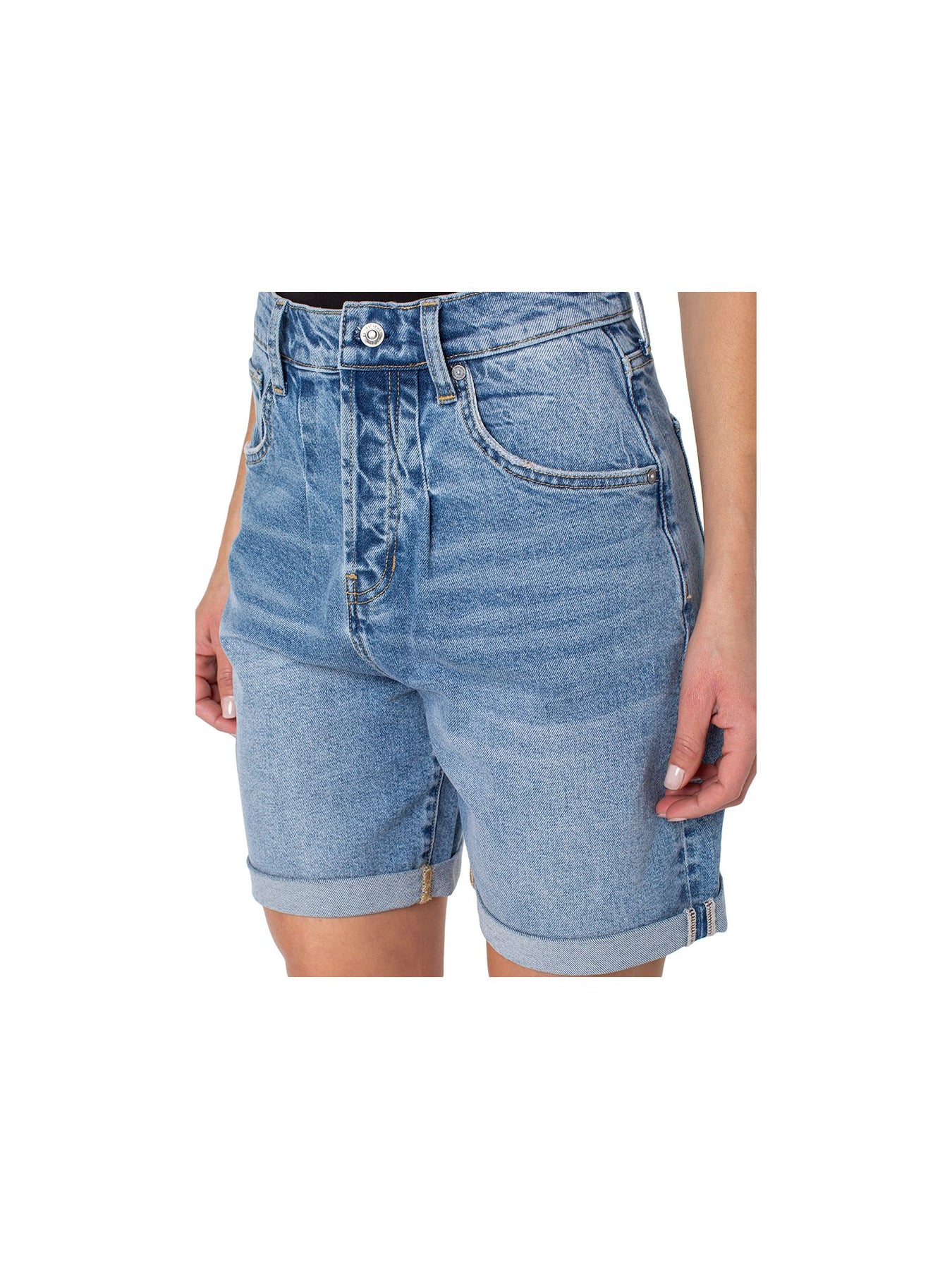 Womens Blue Denim Pocketed Pleated Rolled Cuffs Button Fly High Waist Shorts