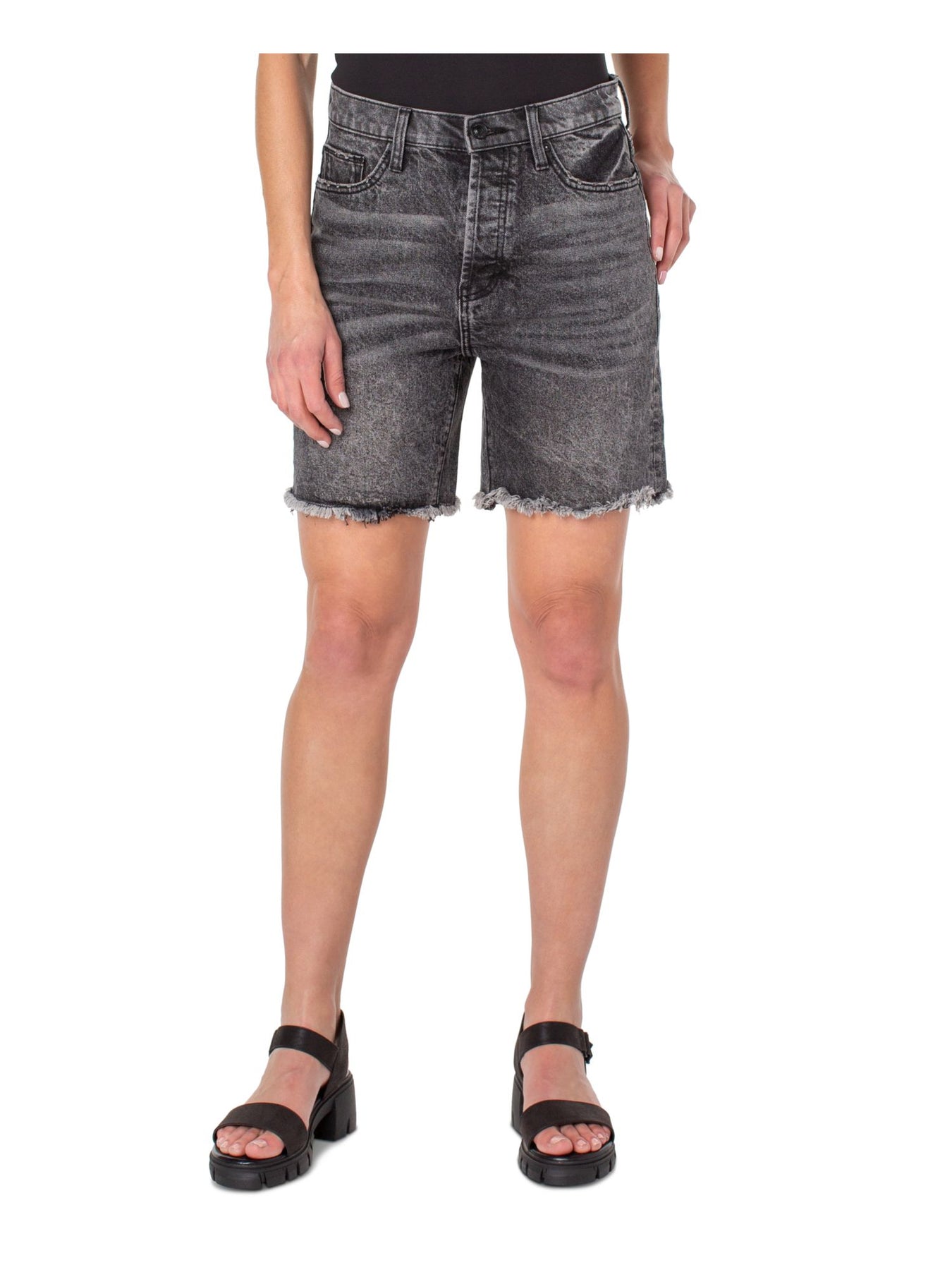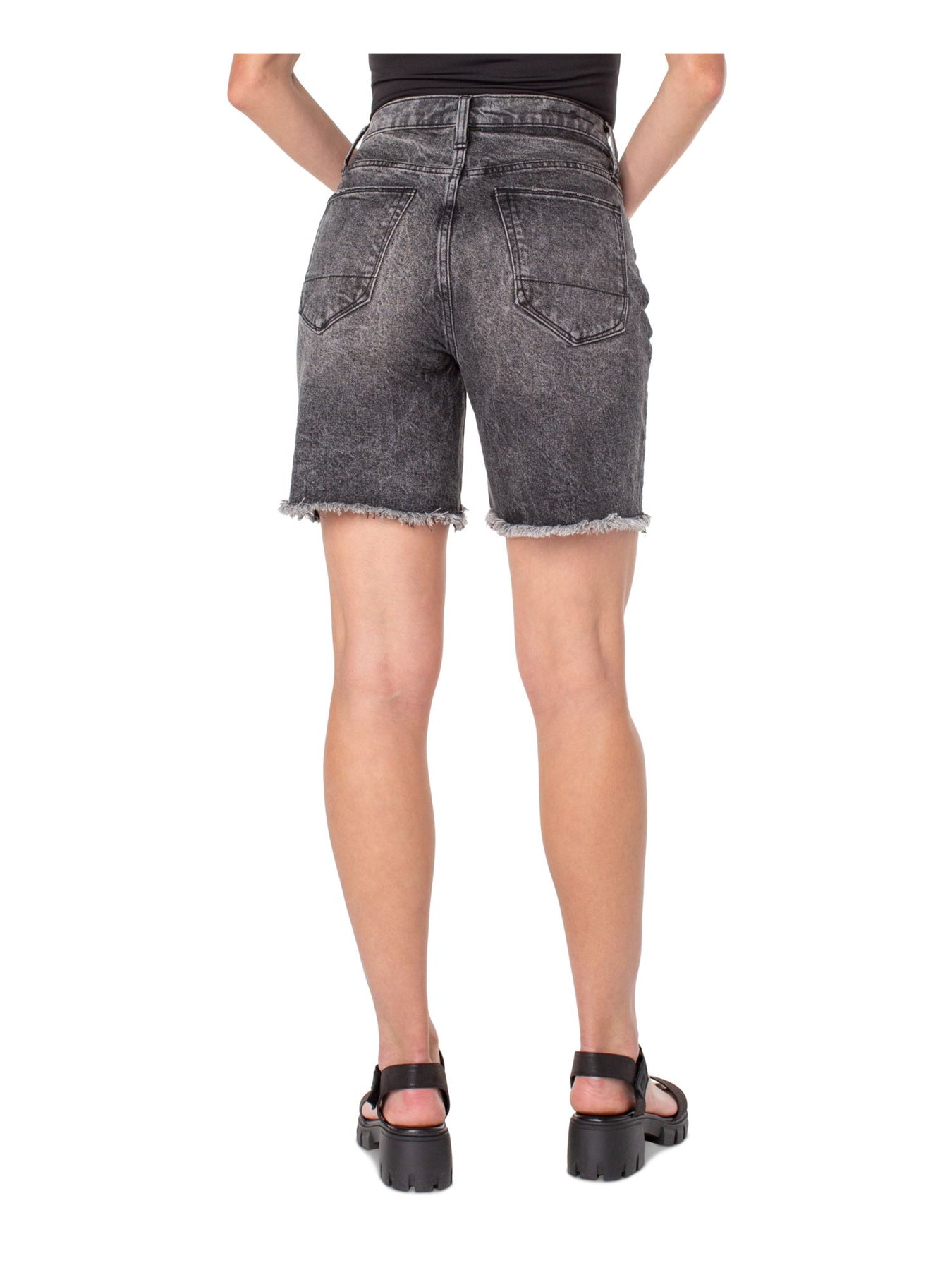 Womens Gray Denim Frayed Pocketed Button Fly High Waist Shorts