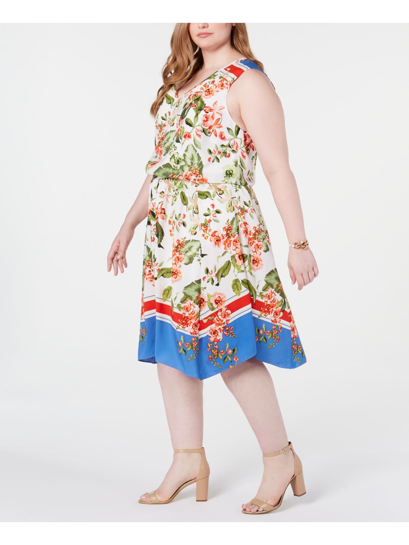 TOMMY HILFIGER Womens Fit + Flare Midi Dress Ivory Sleeveless V Neck Floral Plus 16W
