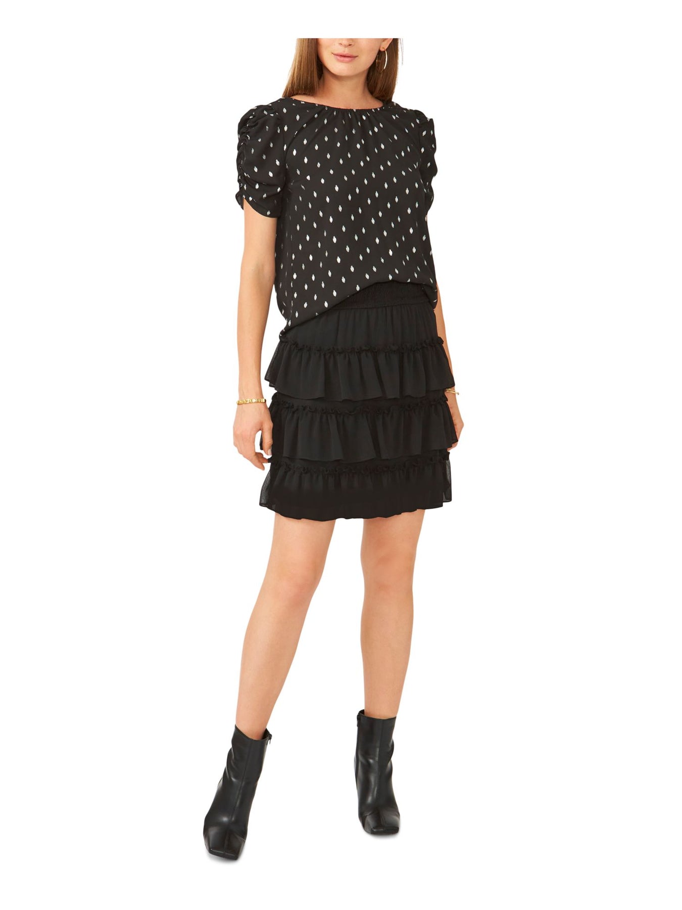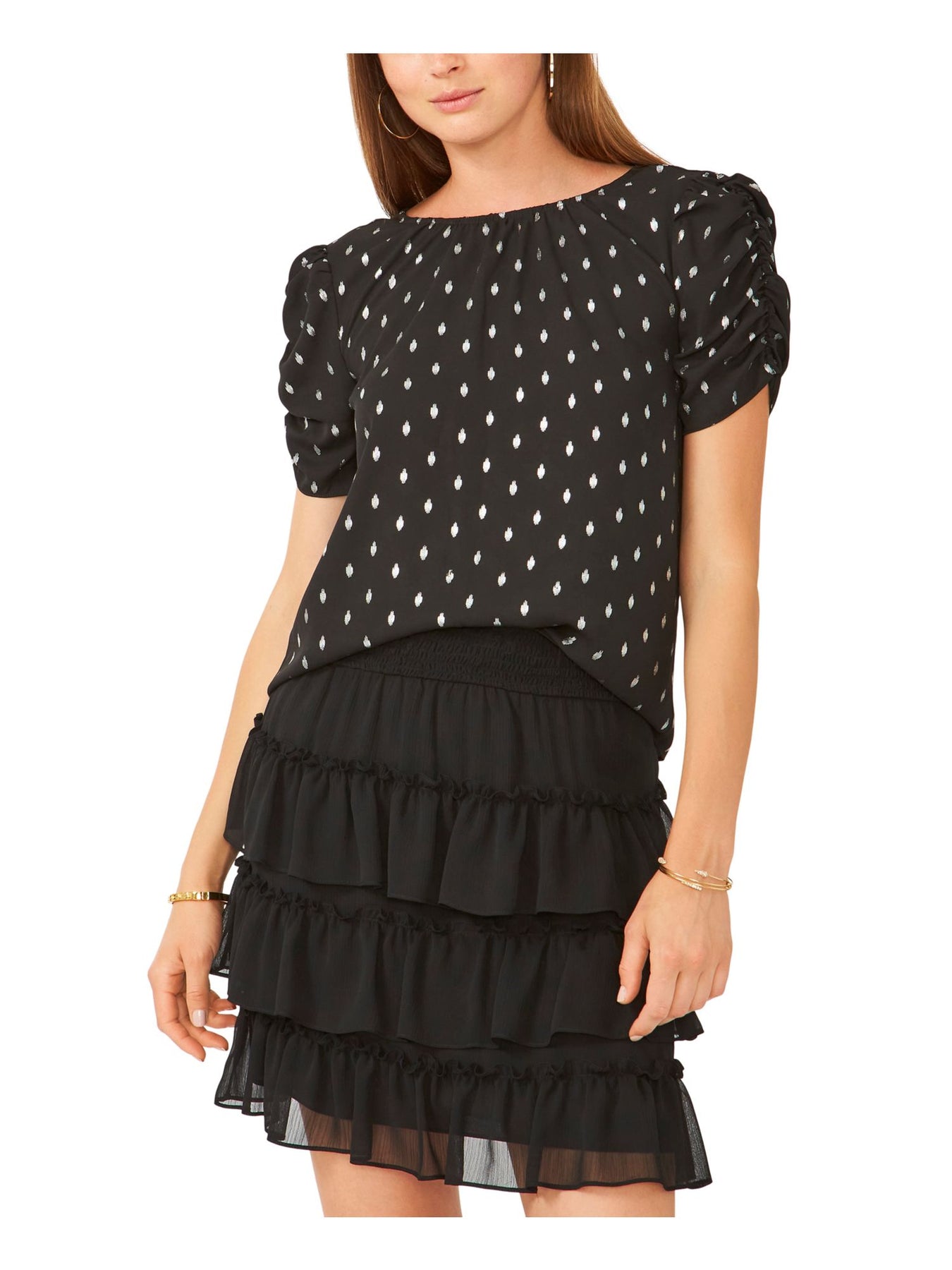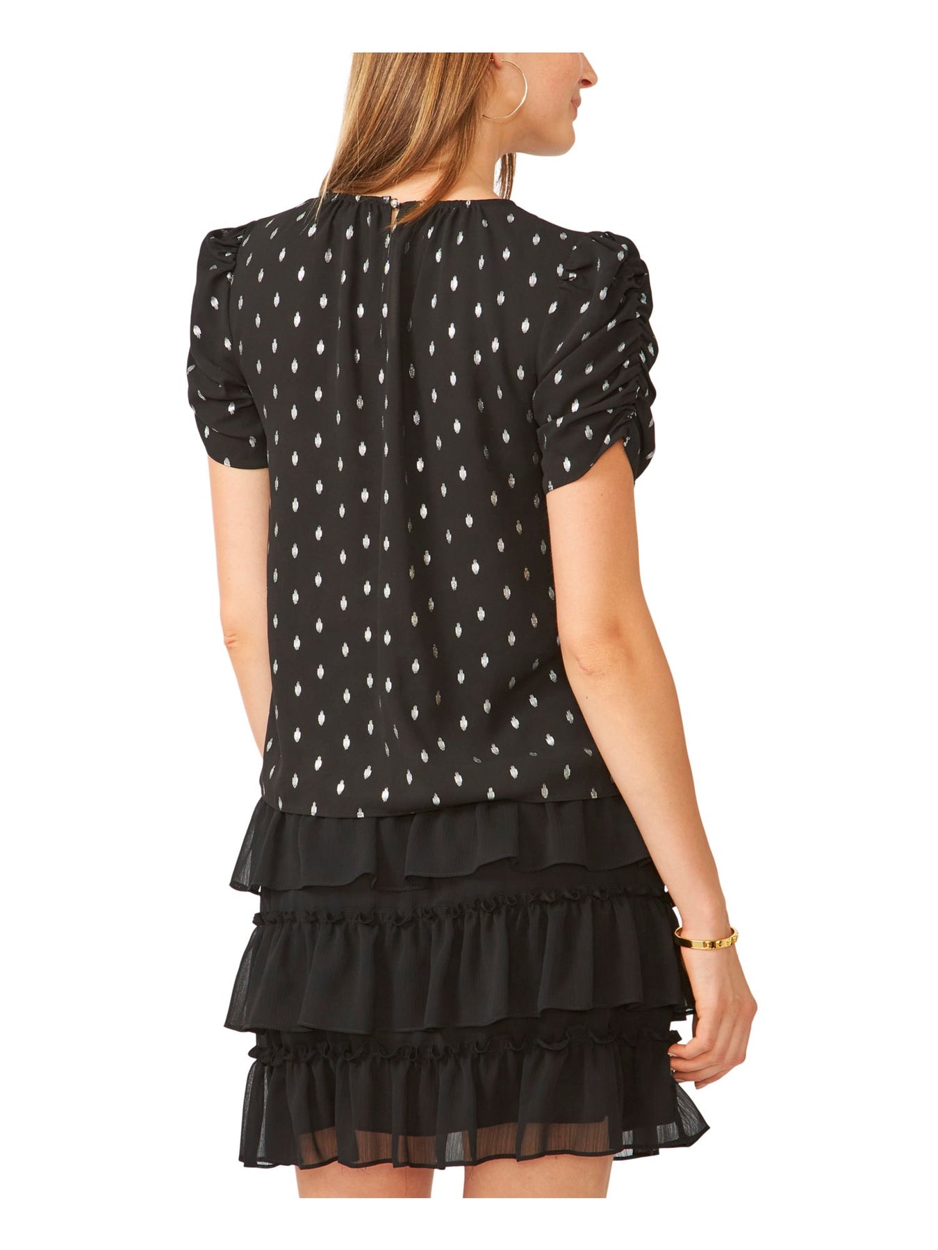 28TH & PARK Womens Black Ruched Gathered Keyhole Back Printed Short Sleeve Jewel Neck Top S