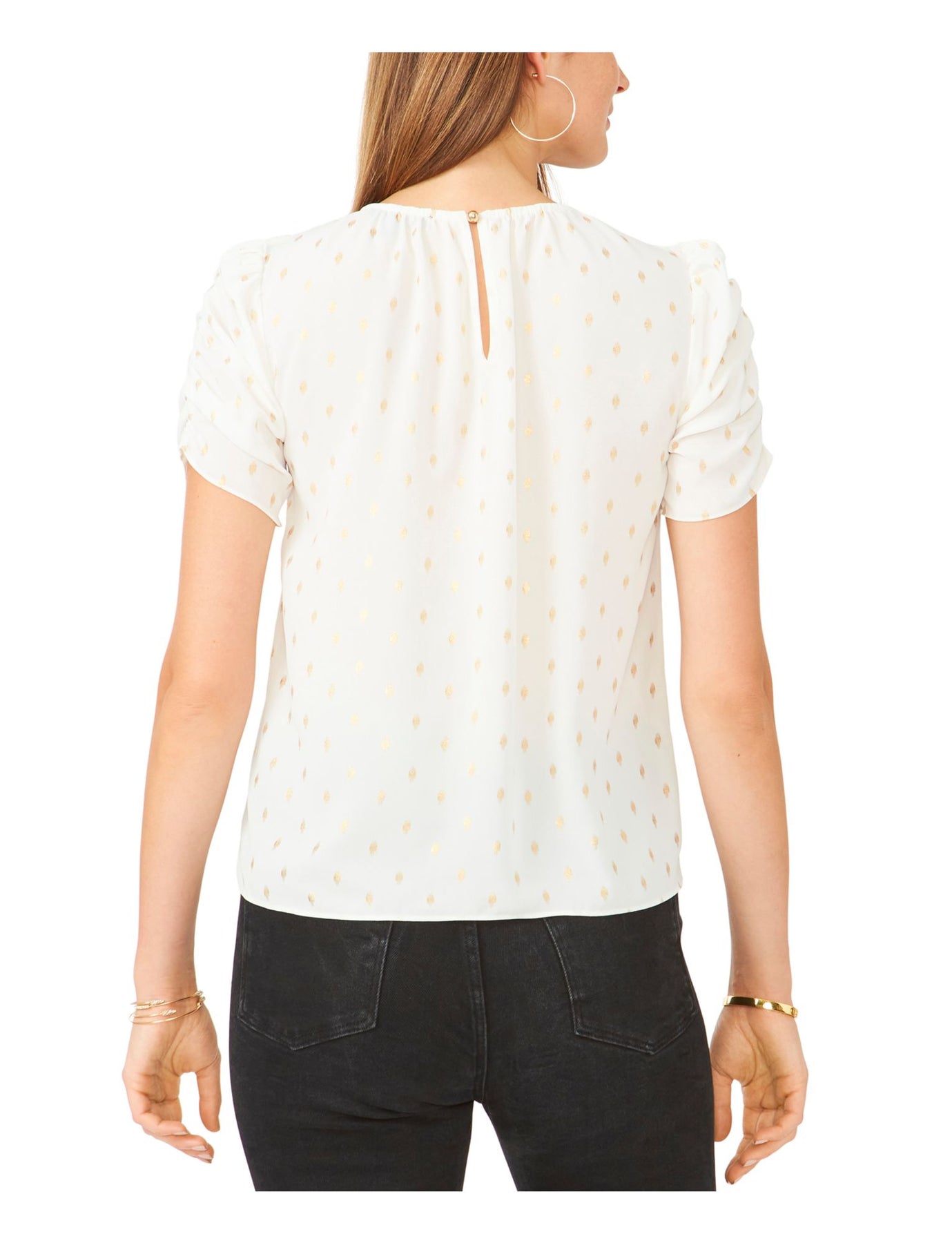 28TH & PARK Womens White Ruched Gathered Keyhole Back Printed Short Sleeve Jewel Neck Top XS
