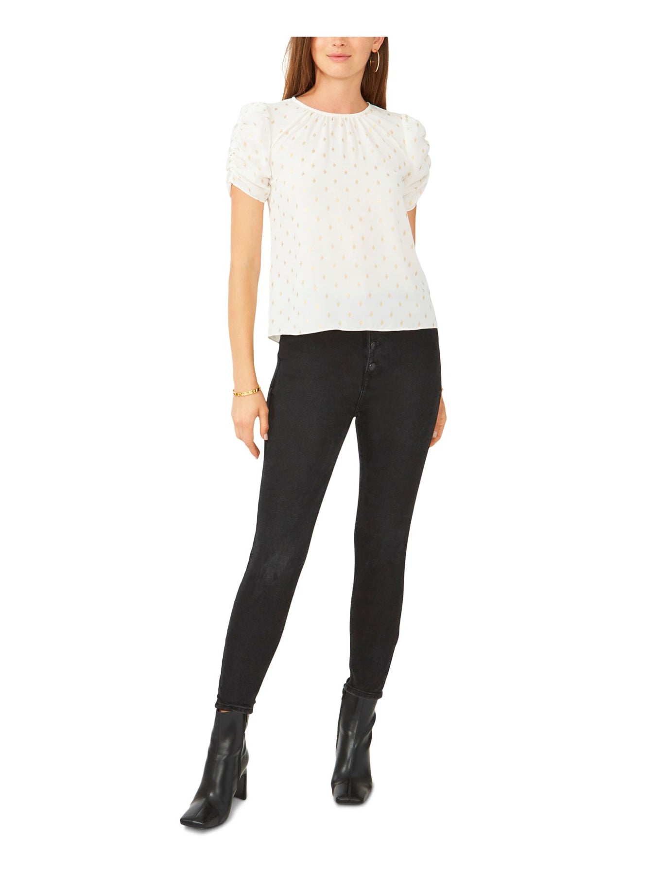 28TH & PARK Womens White Ruched Gathered Keyhole Back Printed Short Sleeve Jewel Neck Top S