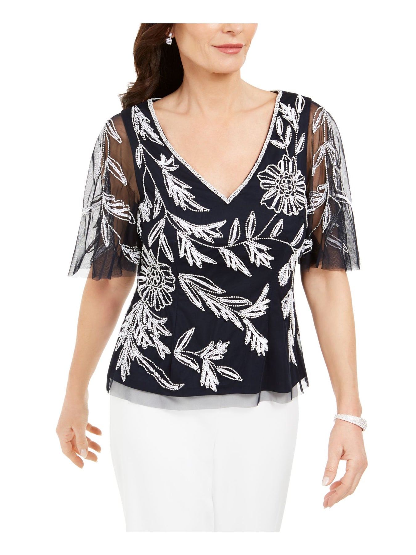ADRIANNA PAPELL Womens Blouse Navy Embellished Flutter V Neck Mesh 4