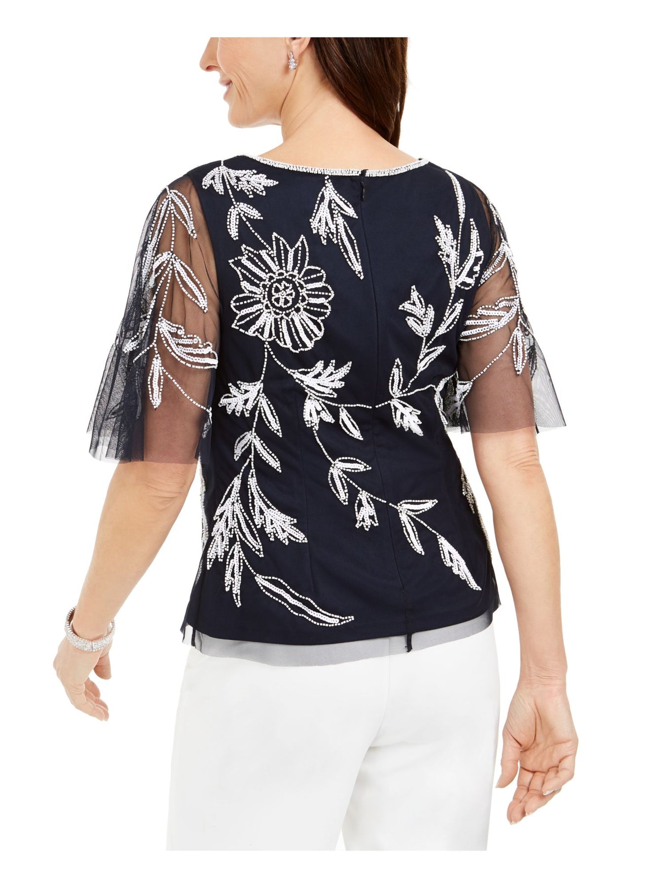 ADRIANNA PAPELL Womens Blouse Navy Embellished Flutter V Neck Mesh 2