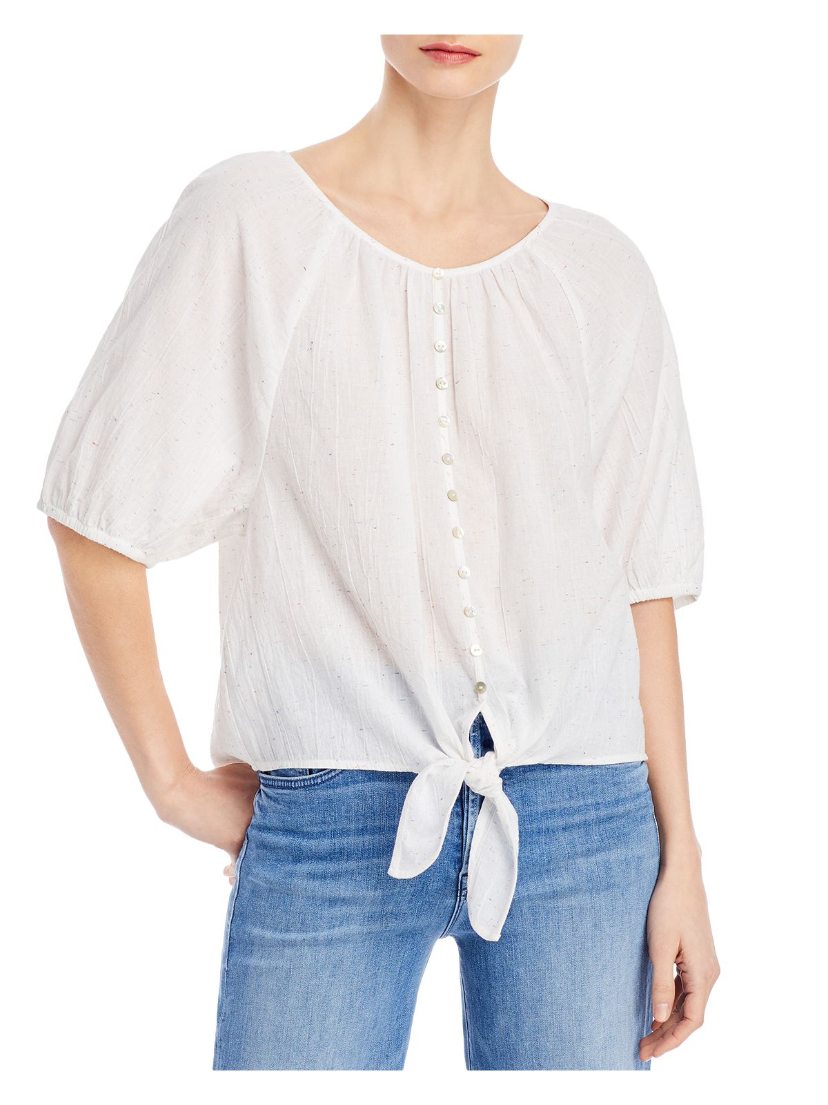 BEACHLUNCHLOUNGE COLLECTION Womens Top Ivory Textured Tie Elbow Sleeve Scoop Neck Speckle Button Up S\P