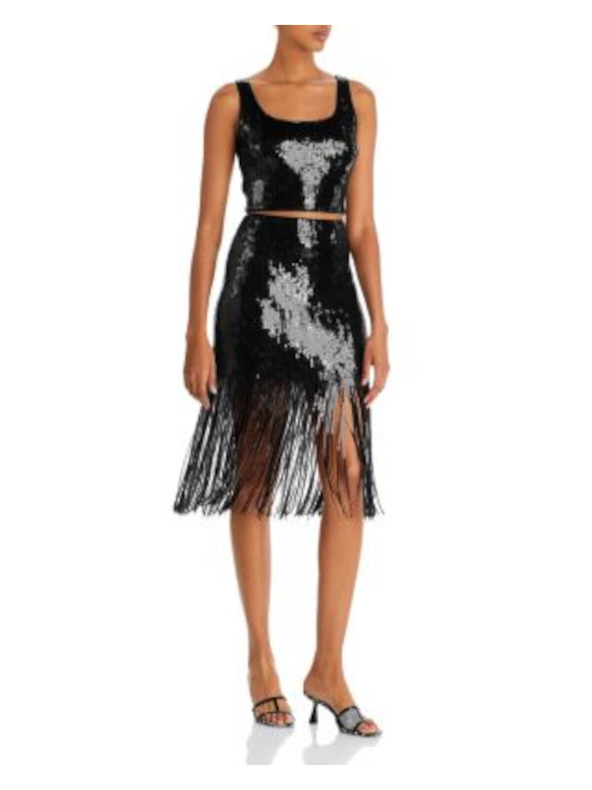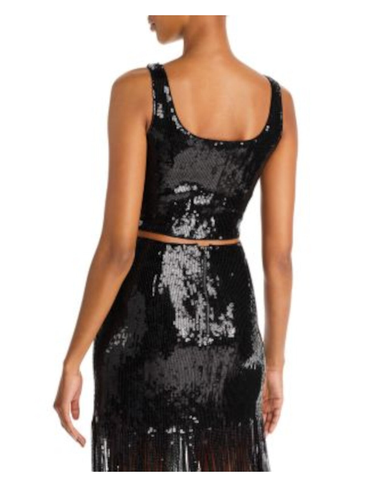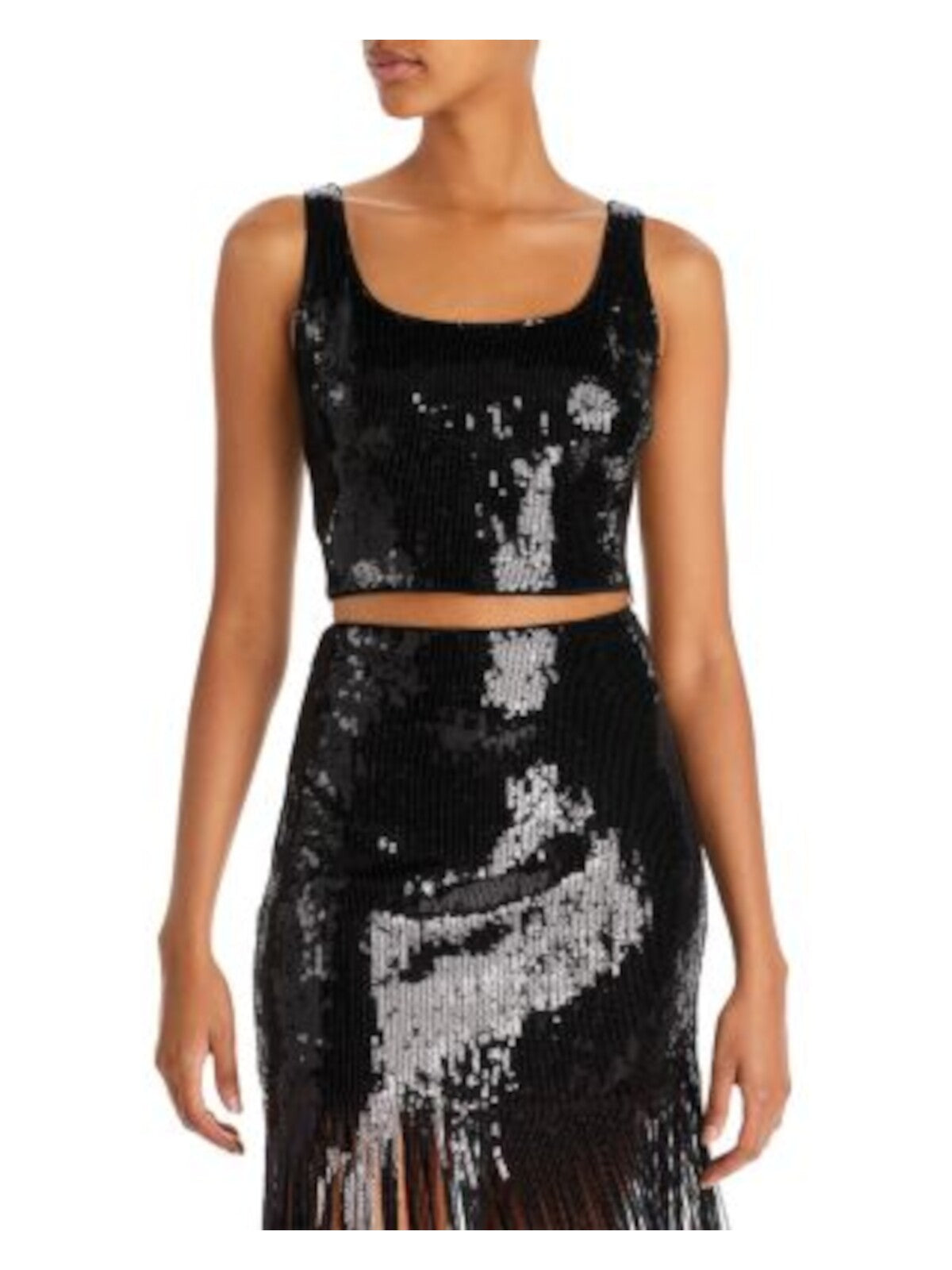 Womens Black Sequined Lined Zippered Sleeveless Square Neck Party Crop Top