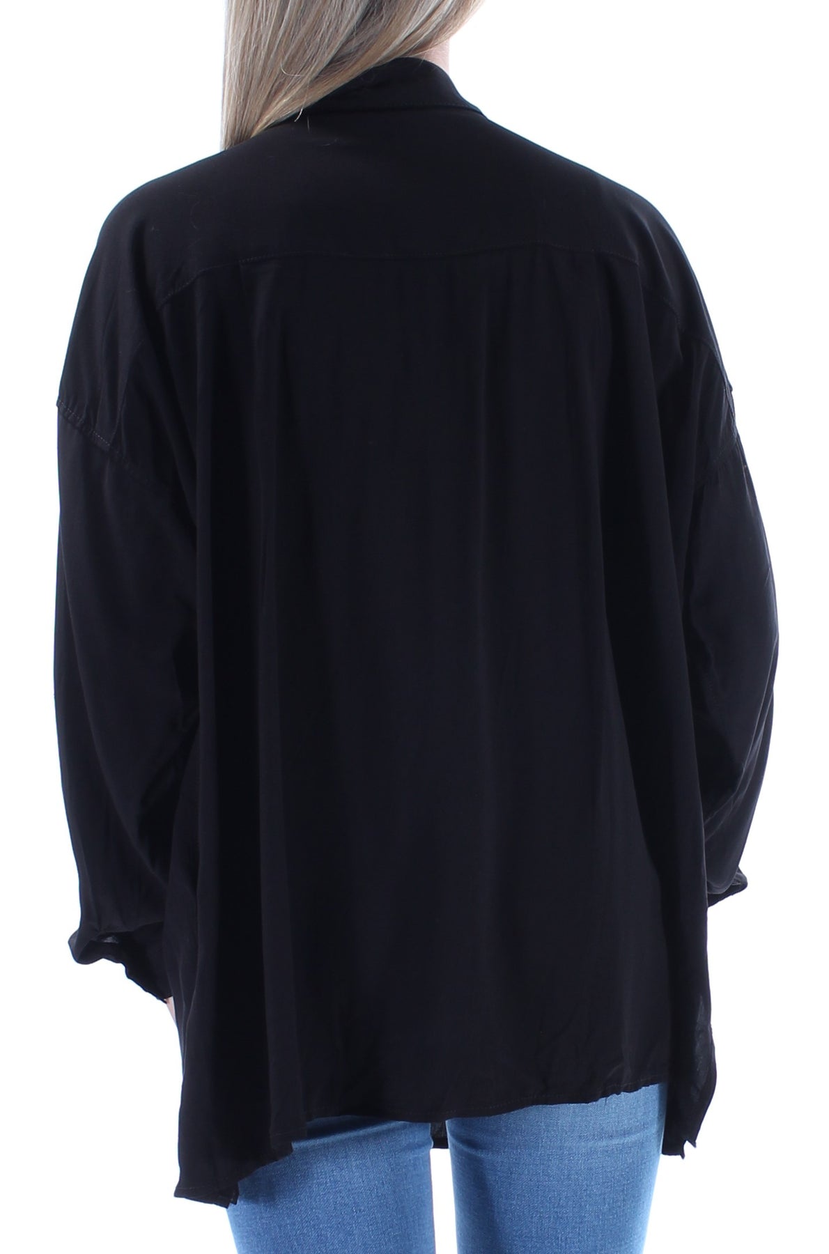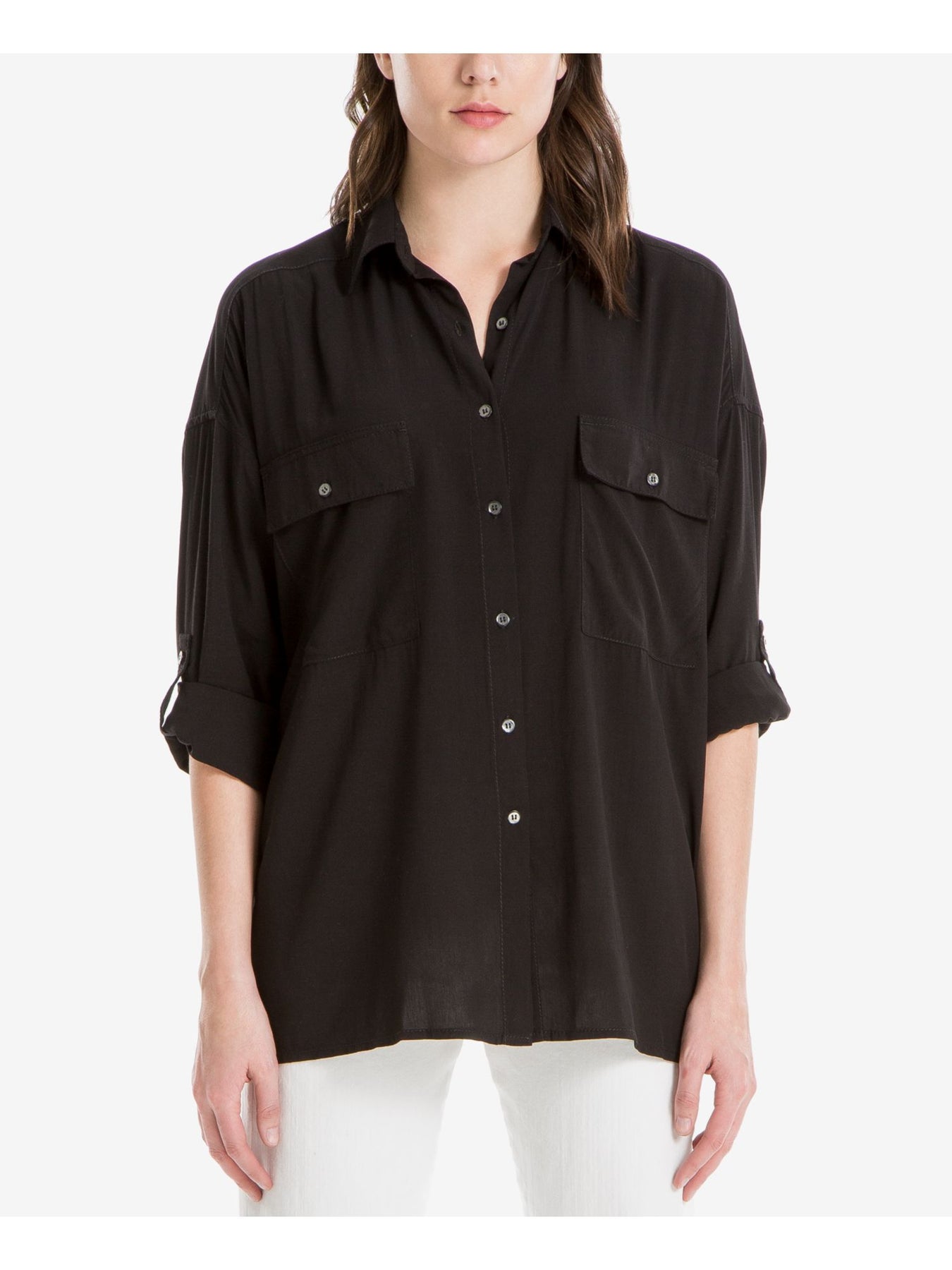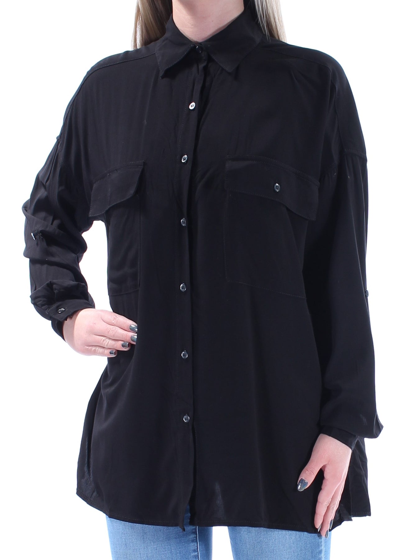 Womens Black Pocketed Cuffed Sleeve Collared Button Up Top