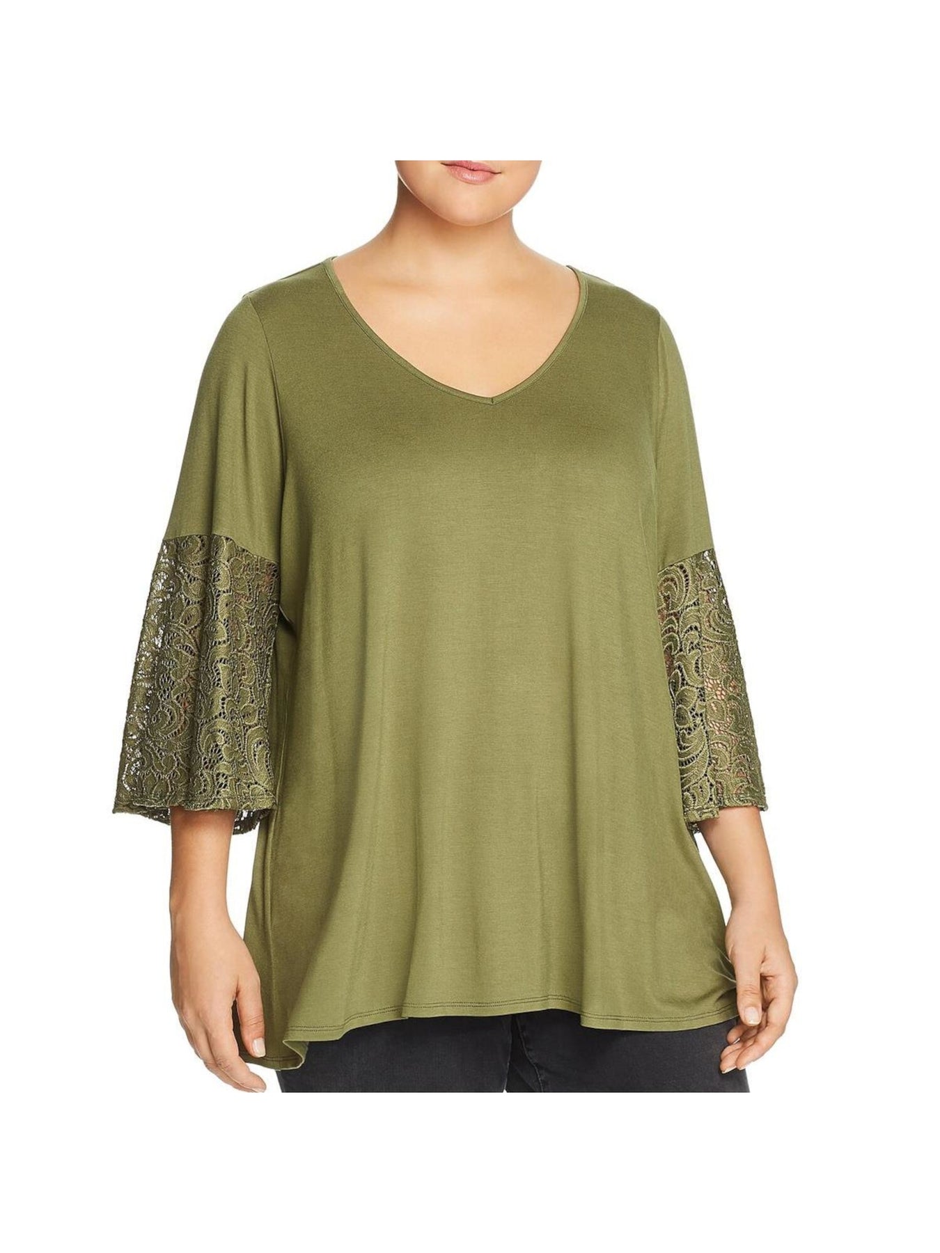 STATUS BY CHENAULT Womens Top Green Stretch Lace Bell Sleeve V Neck Solid Pullover Styling Plus 1X