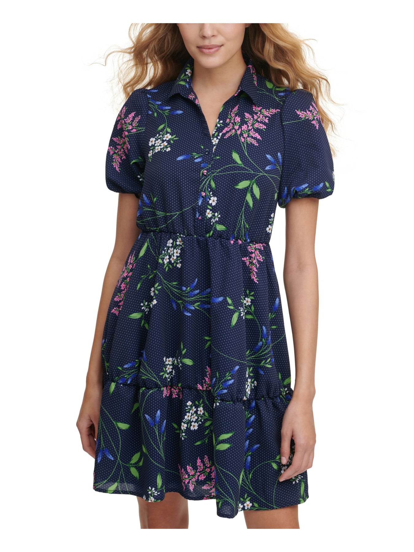 KENSIE DRESSES Womens Navy Pocketed Flounce Hemline Shirred Waist Floral Pouf Sleeve Point Collar Short Wear To Work Shirt Dress 0