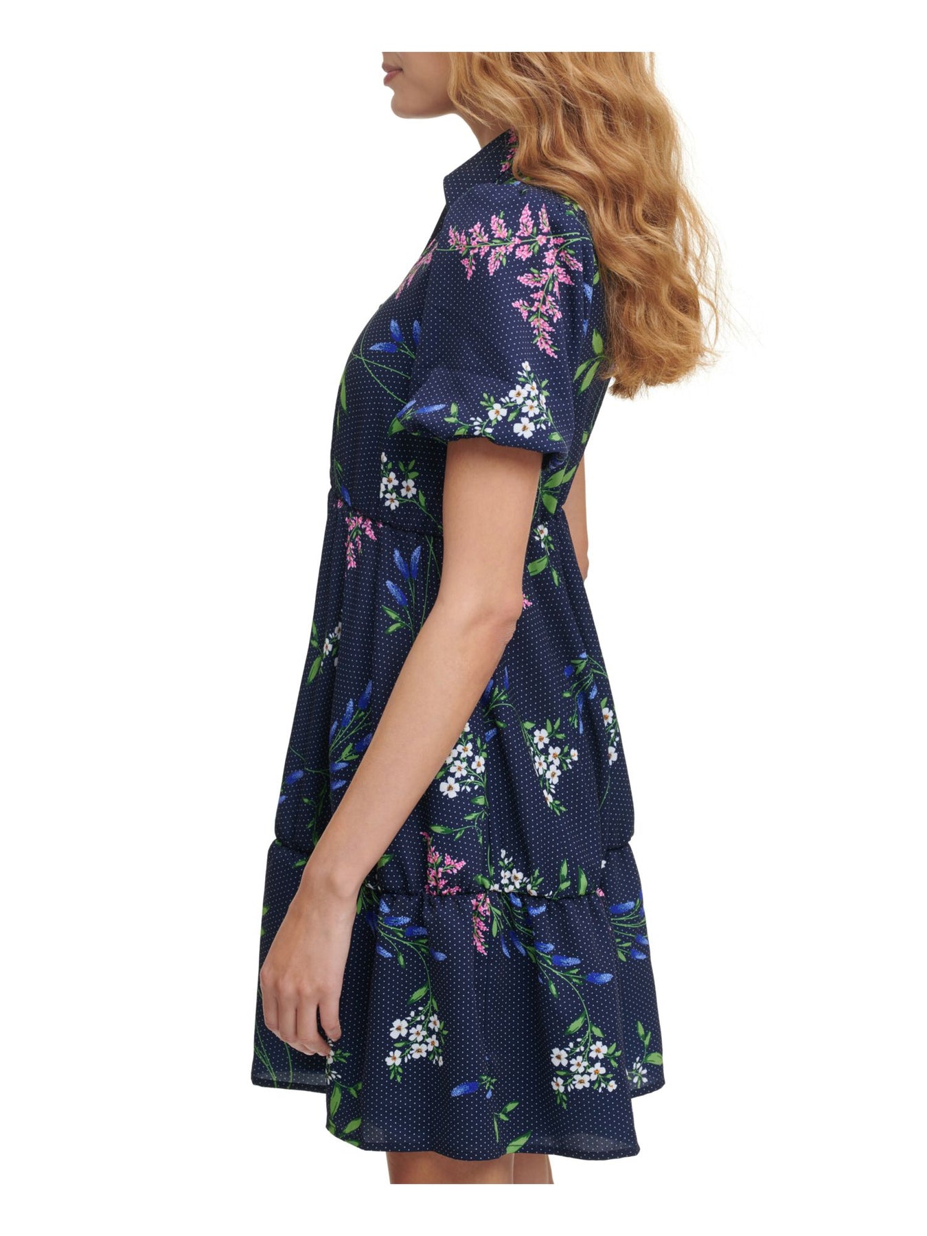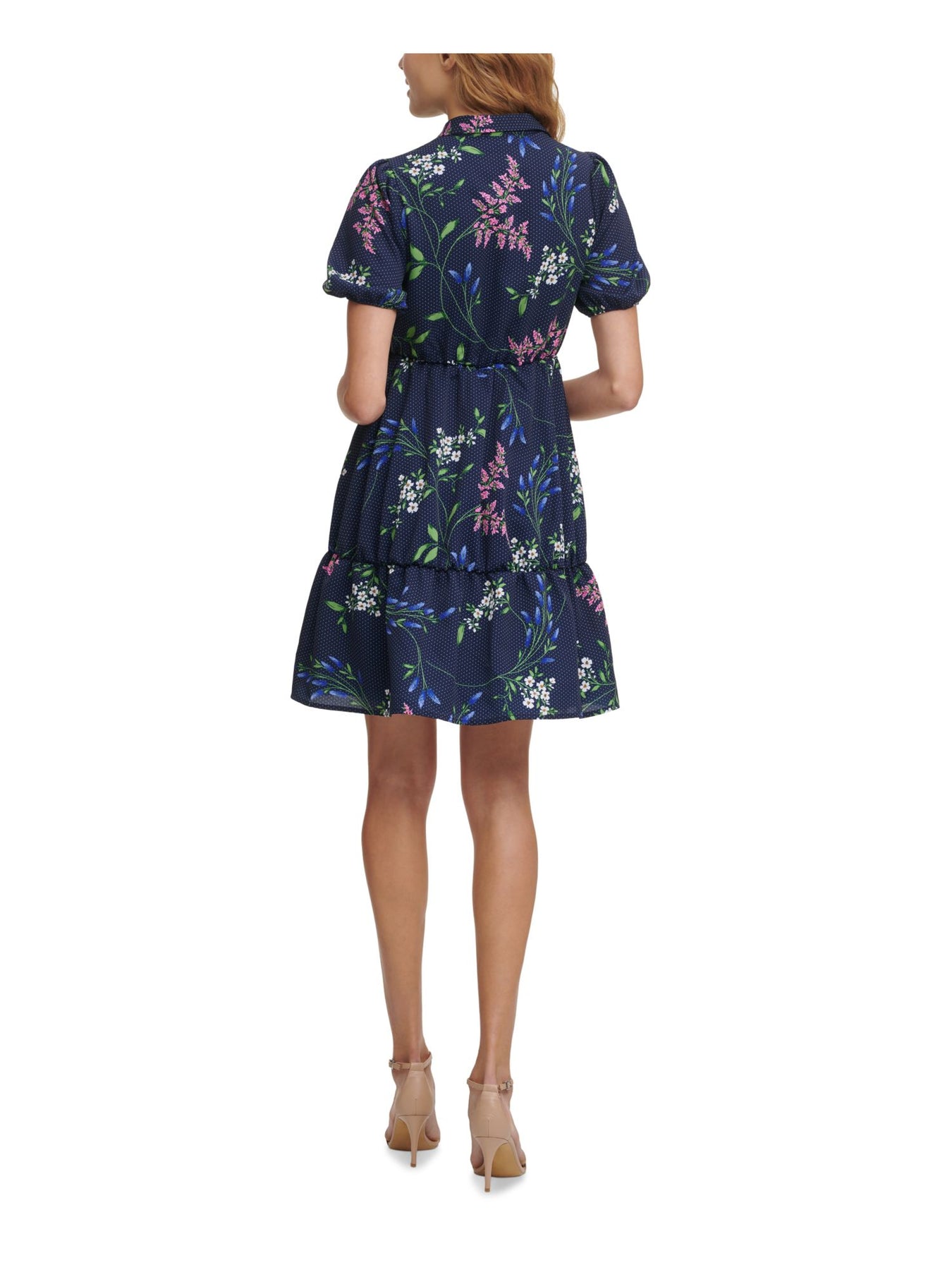 KENSIE DRESSES Womens Navy Pocketed Flounce Hemline Shirred Waist Floral Pouf Sleeve Point Collar Short Wear To Work Shirt Dress 2