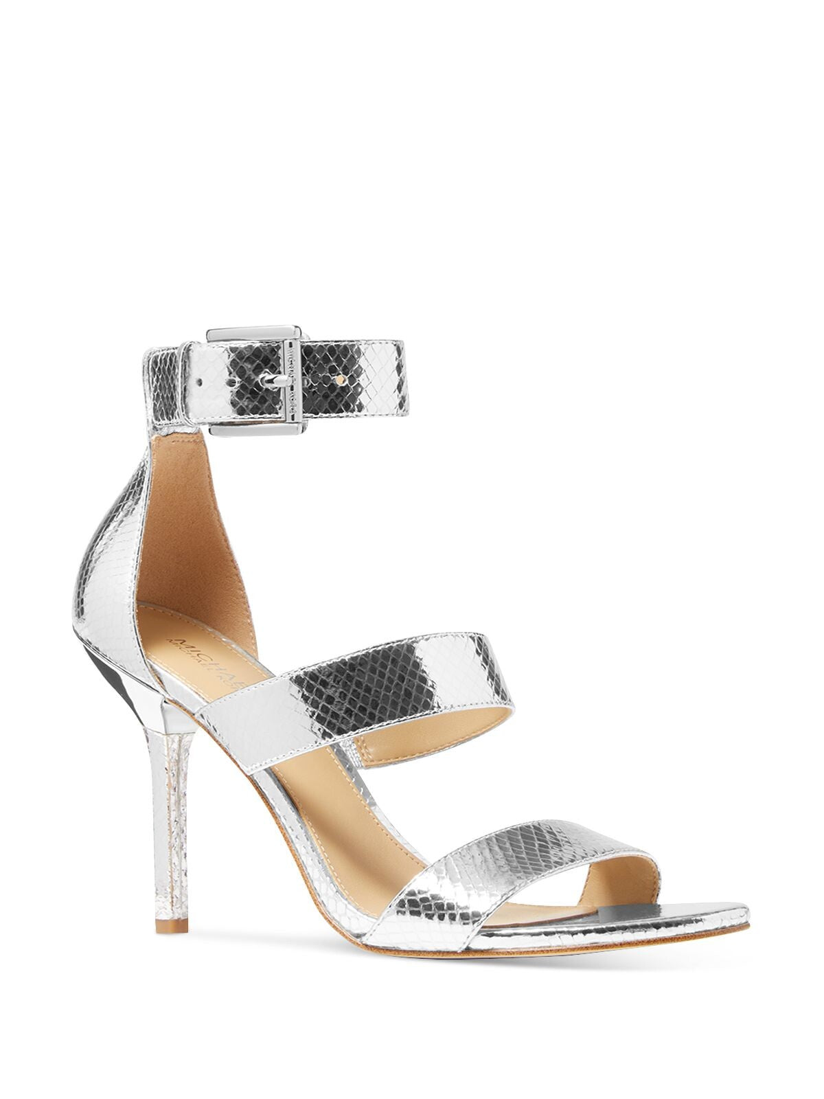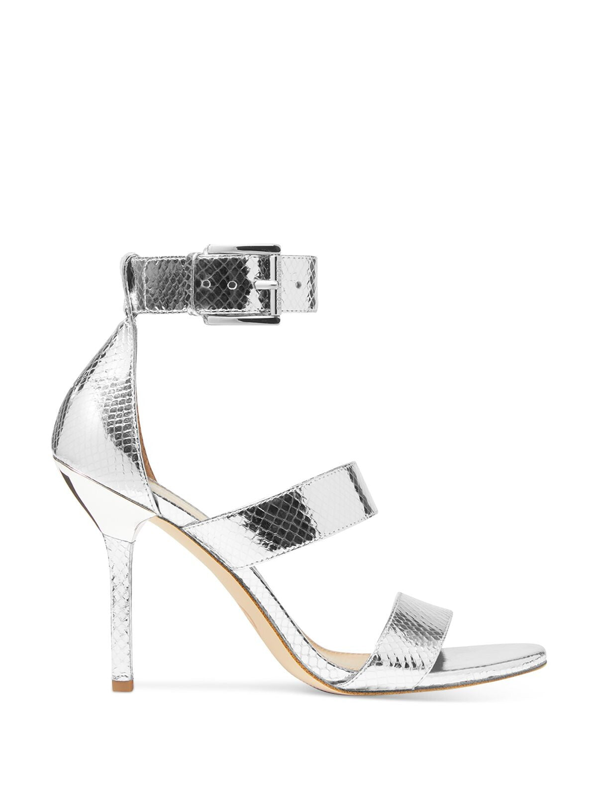 Womens Silver Snake Padded Metallic Ankle Strap Amal Round Toe Stiletto Buckle Leather Heeled M