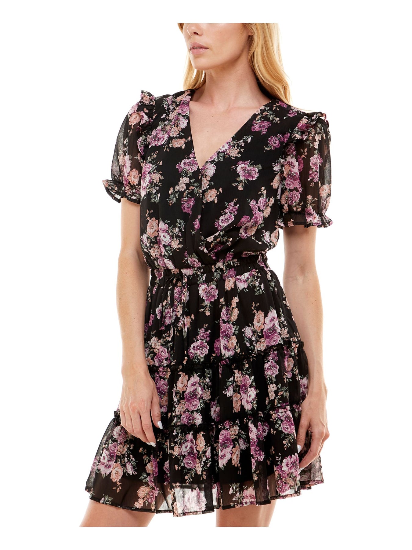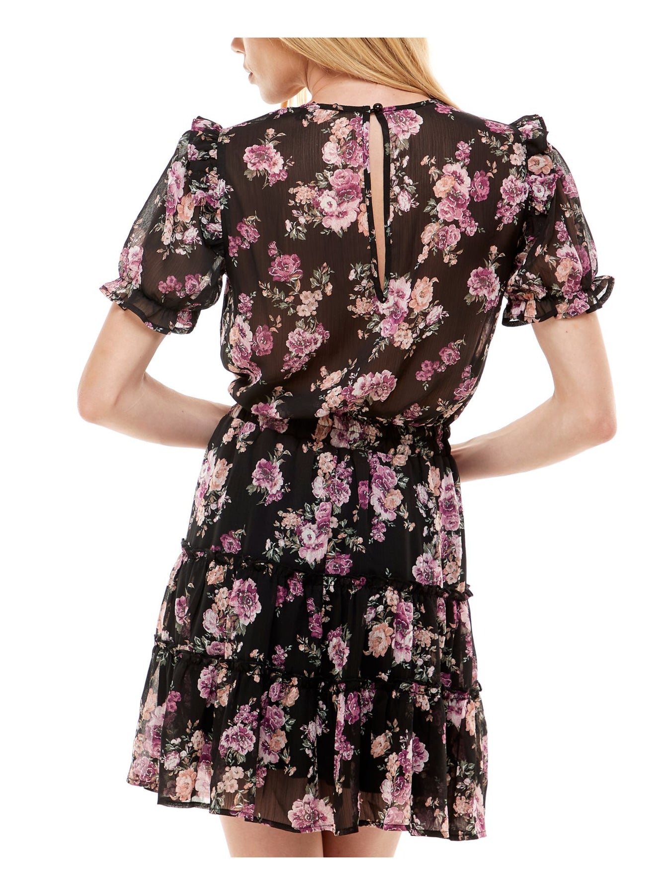 TRIXXI Womens Fit + Flare Above The Knee Dress Black Ruffled Tie Pouf Sleeve Surplice Neckline Party Floral Tiered Sheer Keyhole Back Lined S